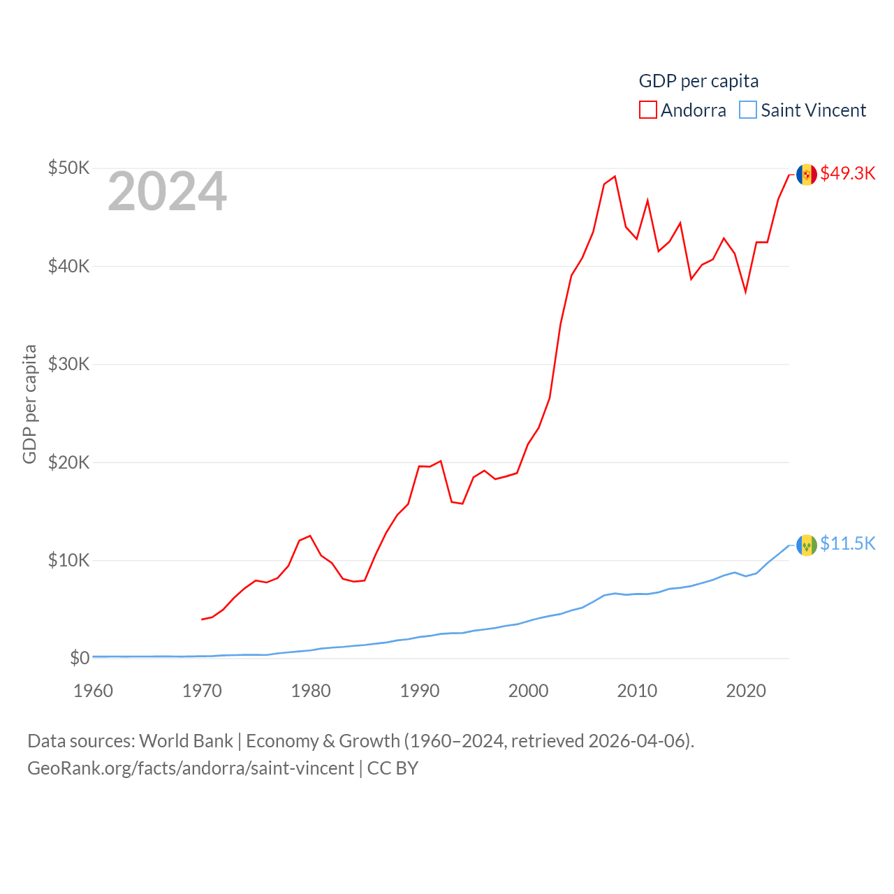 By GDP, Andorra ranks 166/197 ($4.04B) and Saint Vincent ranks 186/197 ($1.16B). By GDP per capita, Andorra ranks 25/197 ($49,304), while Saint Vincent ranks 81/197 ($11,501).