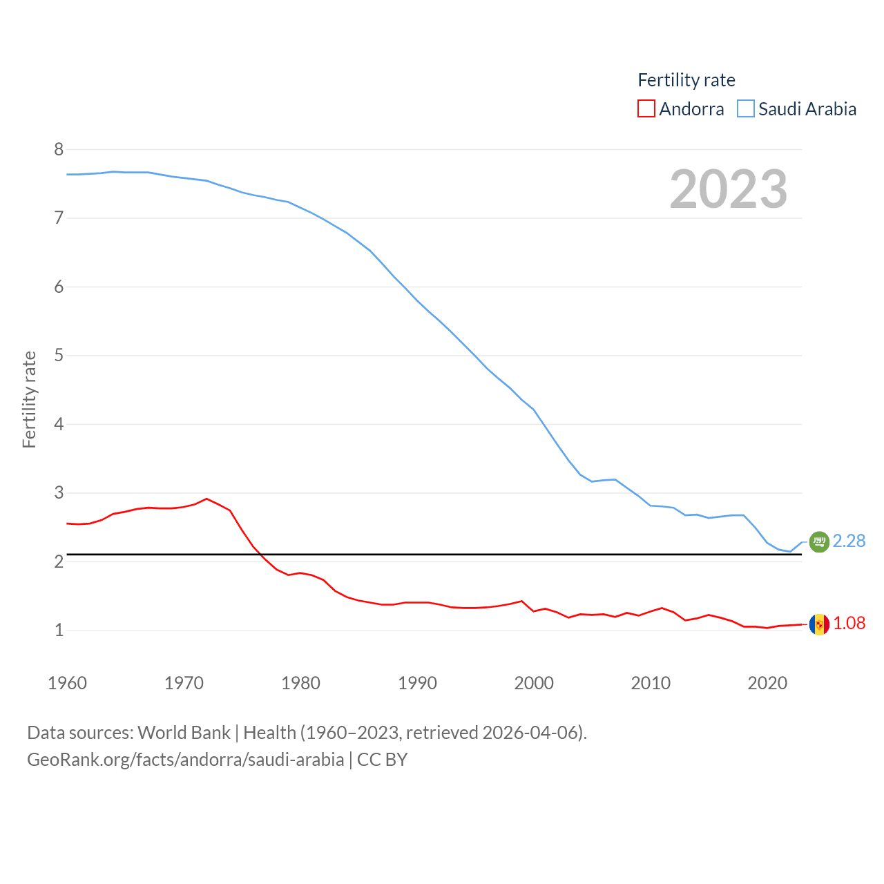 Andorra has a population of 81.9K (ranked 186/197), compared with 35.3M in Saudi Arabia (ranked 45/197). Andorra's land area is 181.5 sq mi versus 830,000 sq mi for Saudi Arabia (ranked 179th vs. 12th).