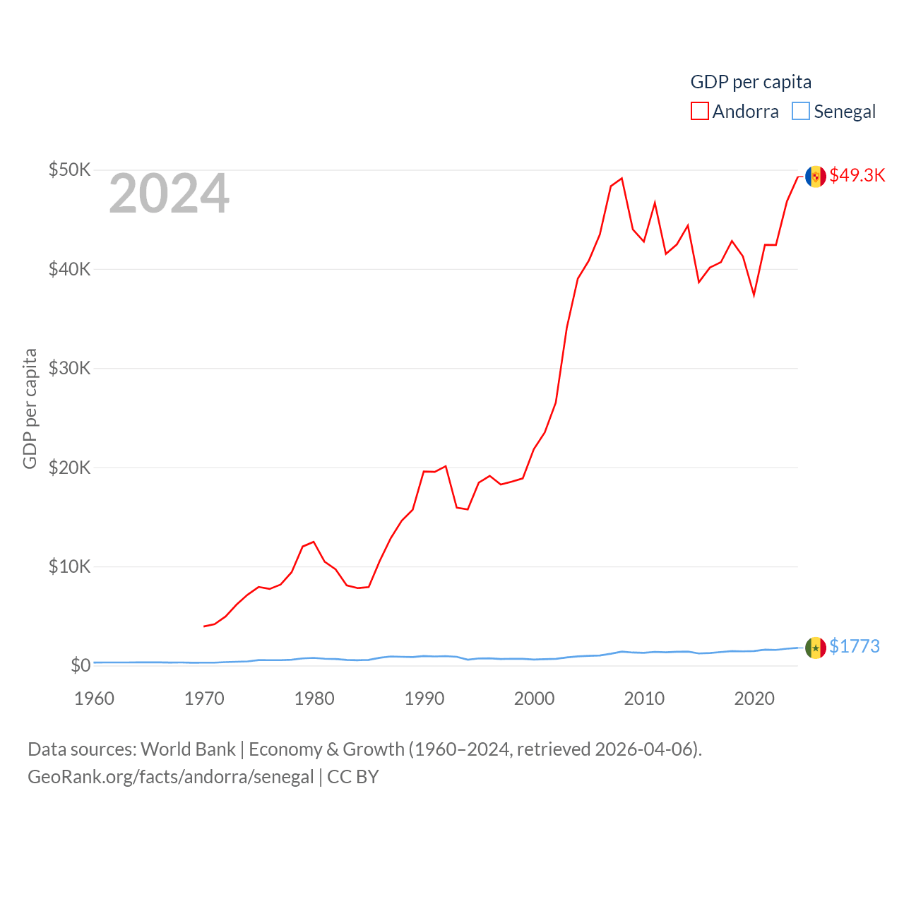By GDP, Andorra ranks 166/197 ($4.04B) and Senegal ranks 109/197 ($32.8B). By GDP per capita, Andorra ranks 25/197 ($49,304), while Senegal ranks 159/197 ($1,773).