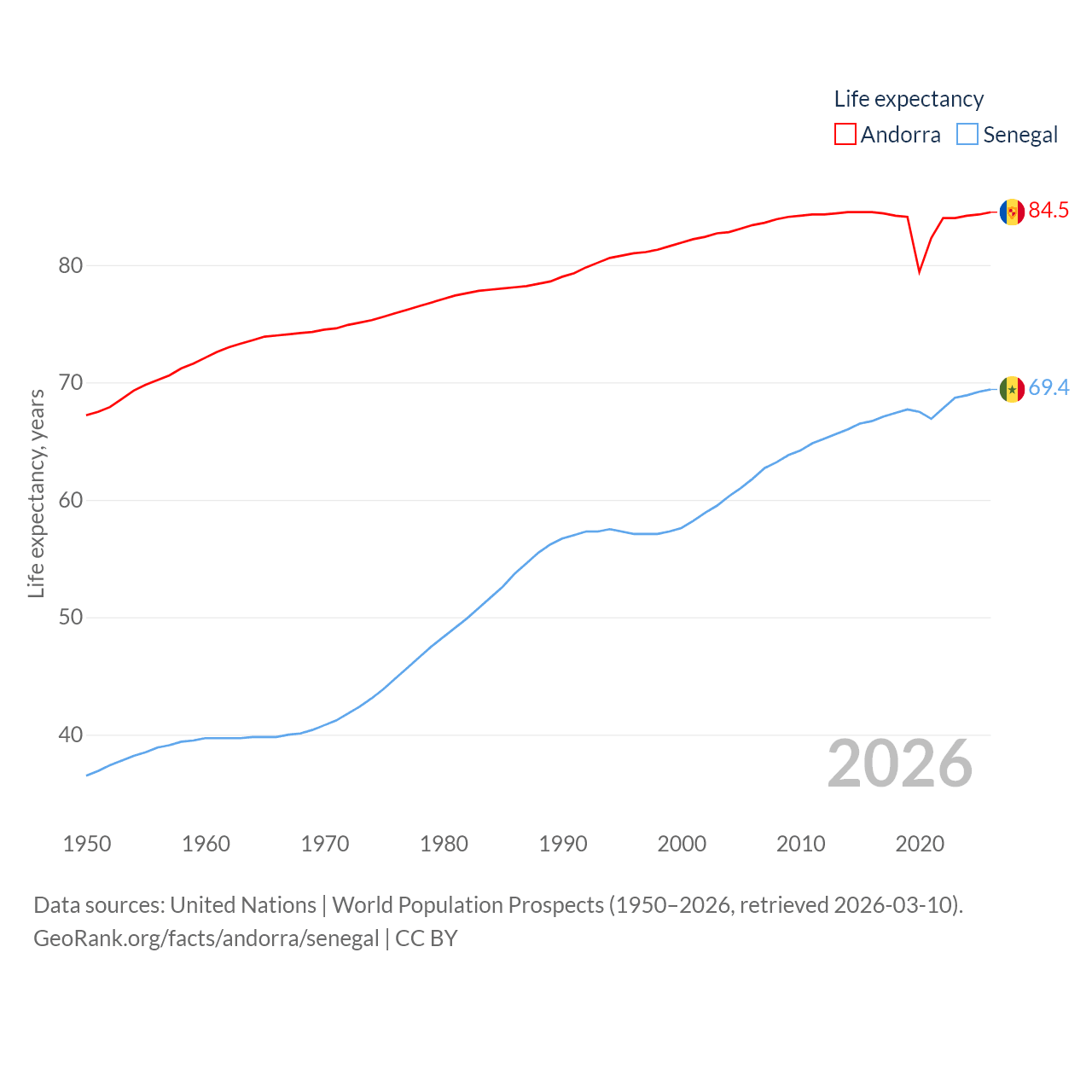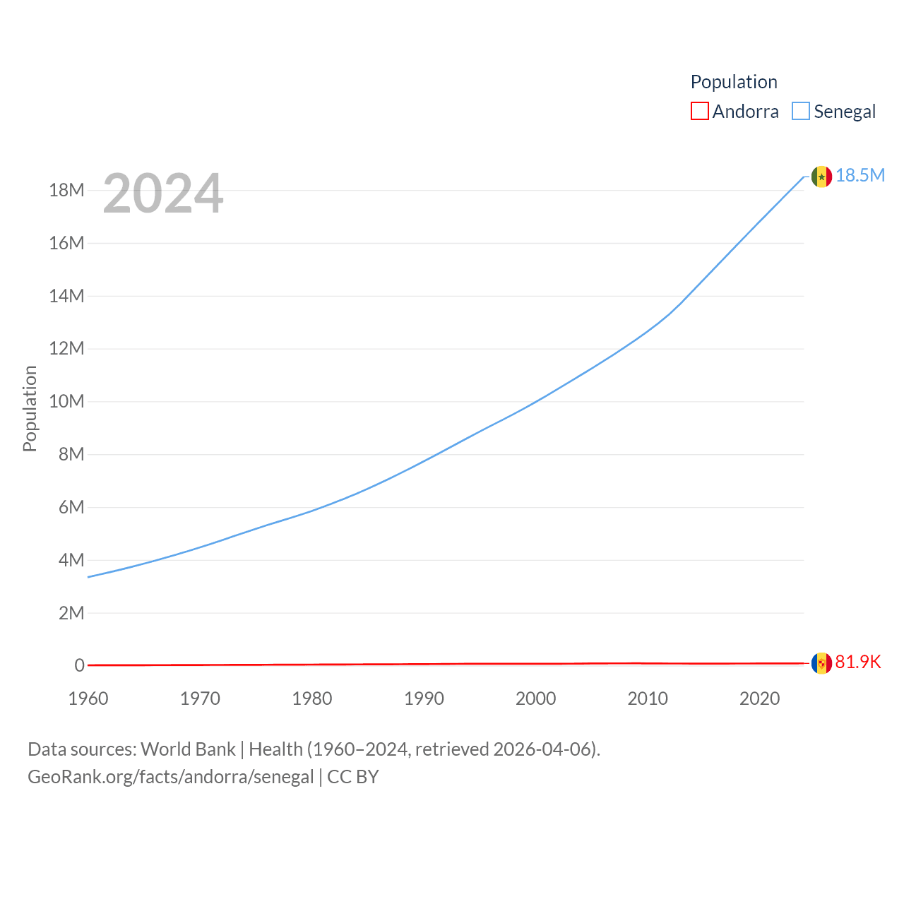 Andorra has a population of 81.9K (ranked 186/197), compared with 18.5M in Senegal (ranked 69/197). Andorra's land area is 181.5 sq mi versus 74,336 sq mi for Senegal (ranked 179th vs. 85th).
