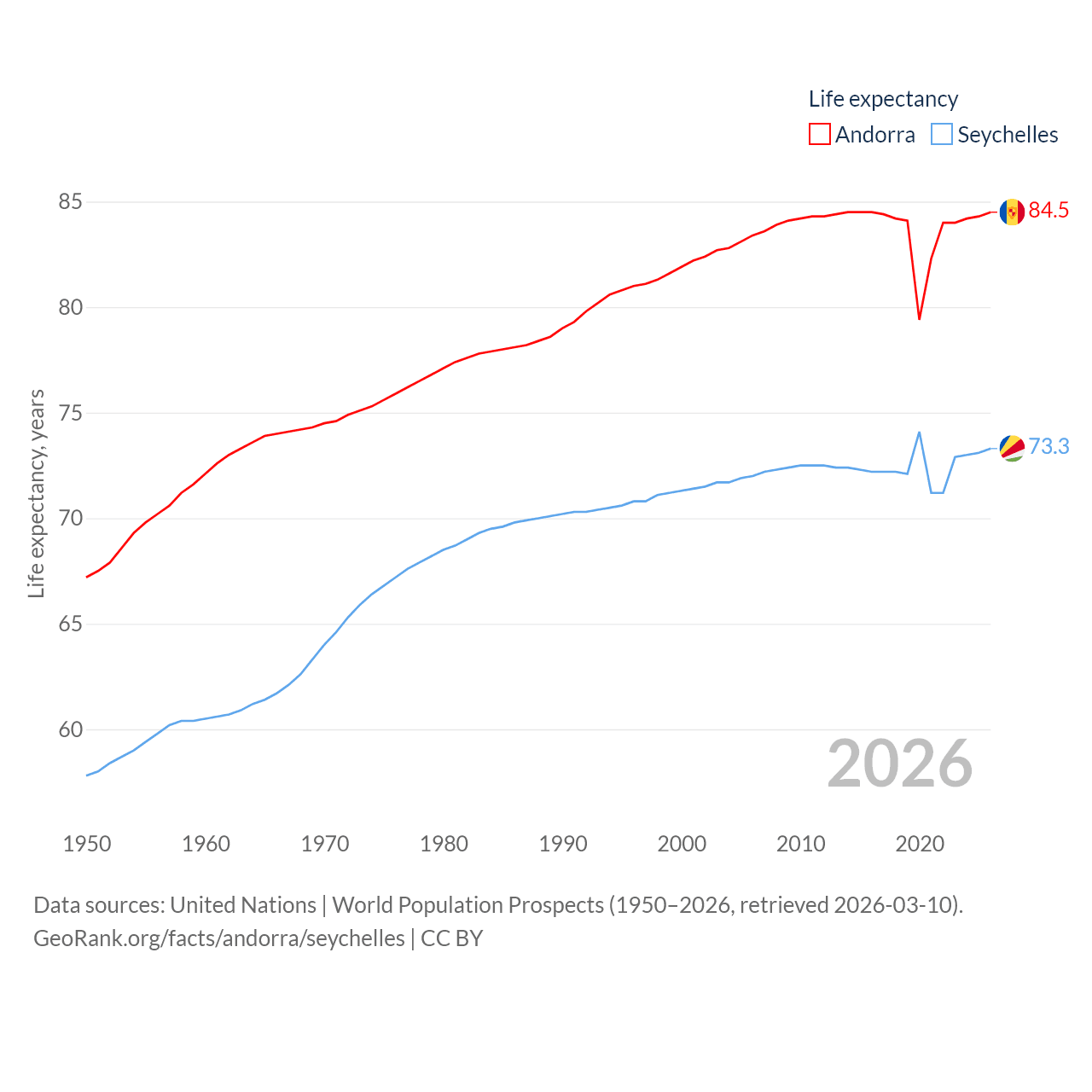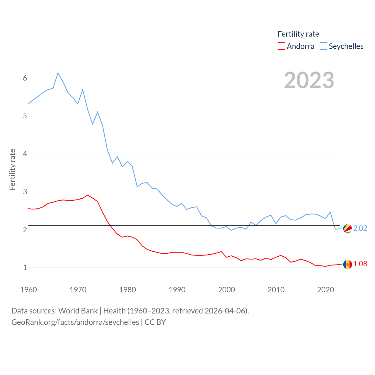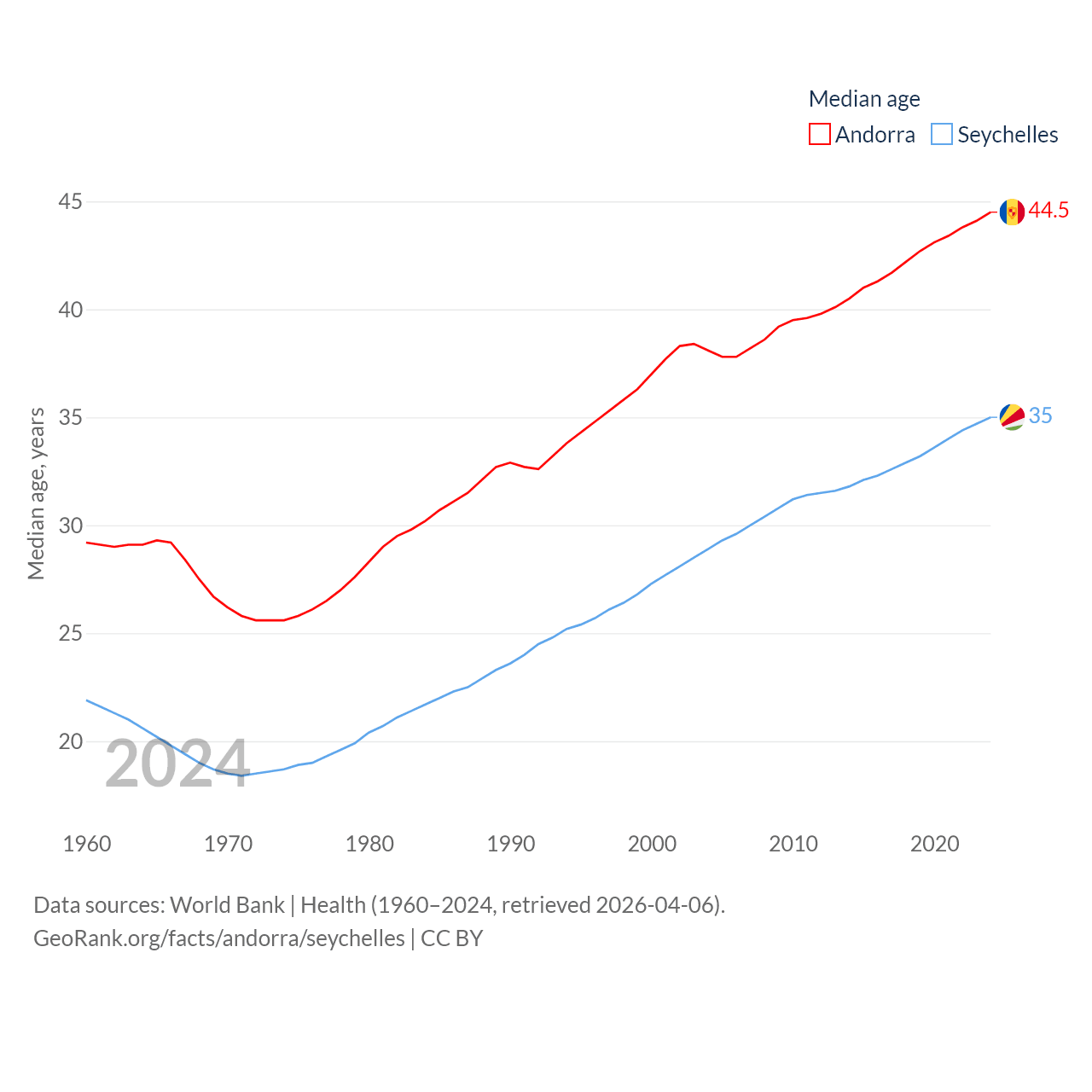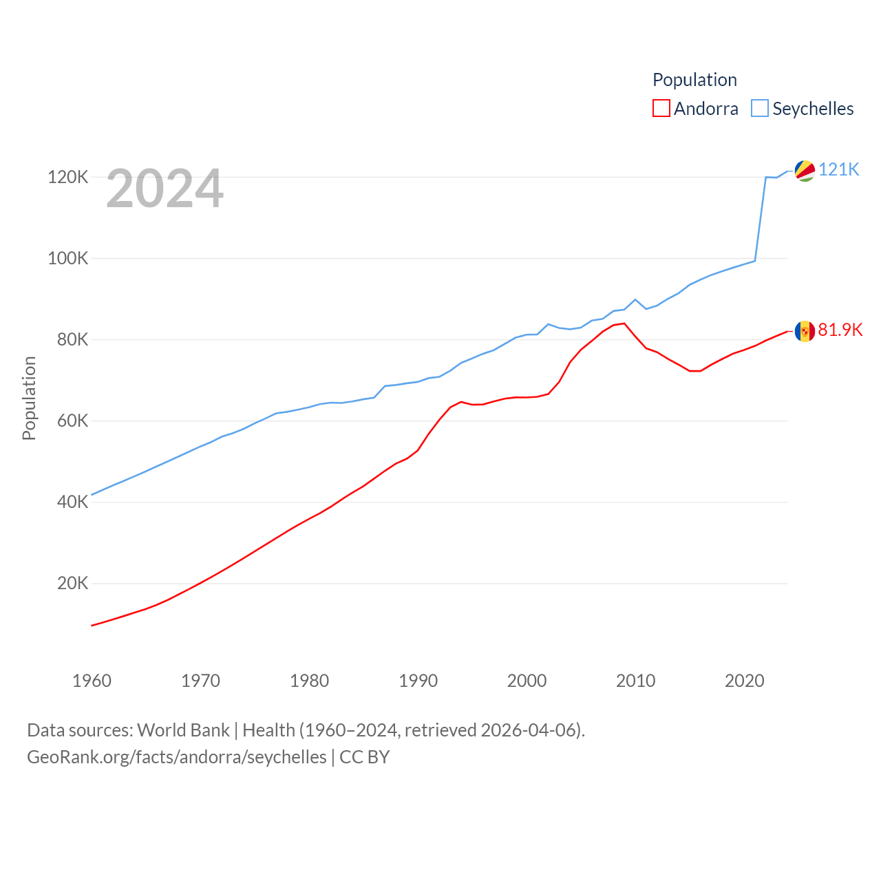 Andorra has a population of 81.9K (ranked 186/197), compared with 121K in The Seychelles (ranked 181/197). Andorra's land area is 181.5 sq mi versus 177.6 sq mi for The Seychelles (ranked 179th vs. 181st).