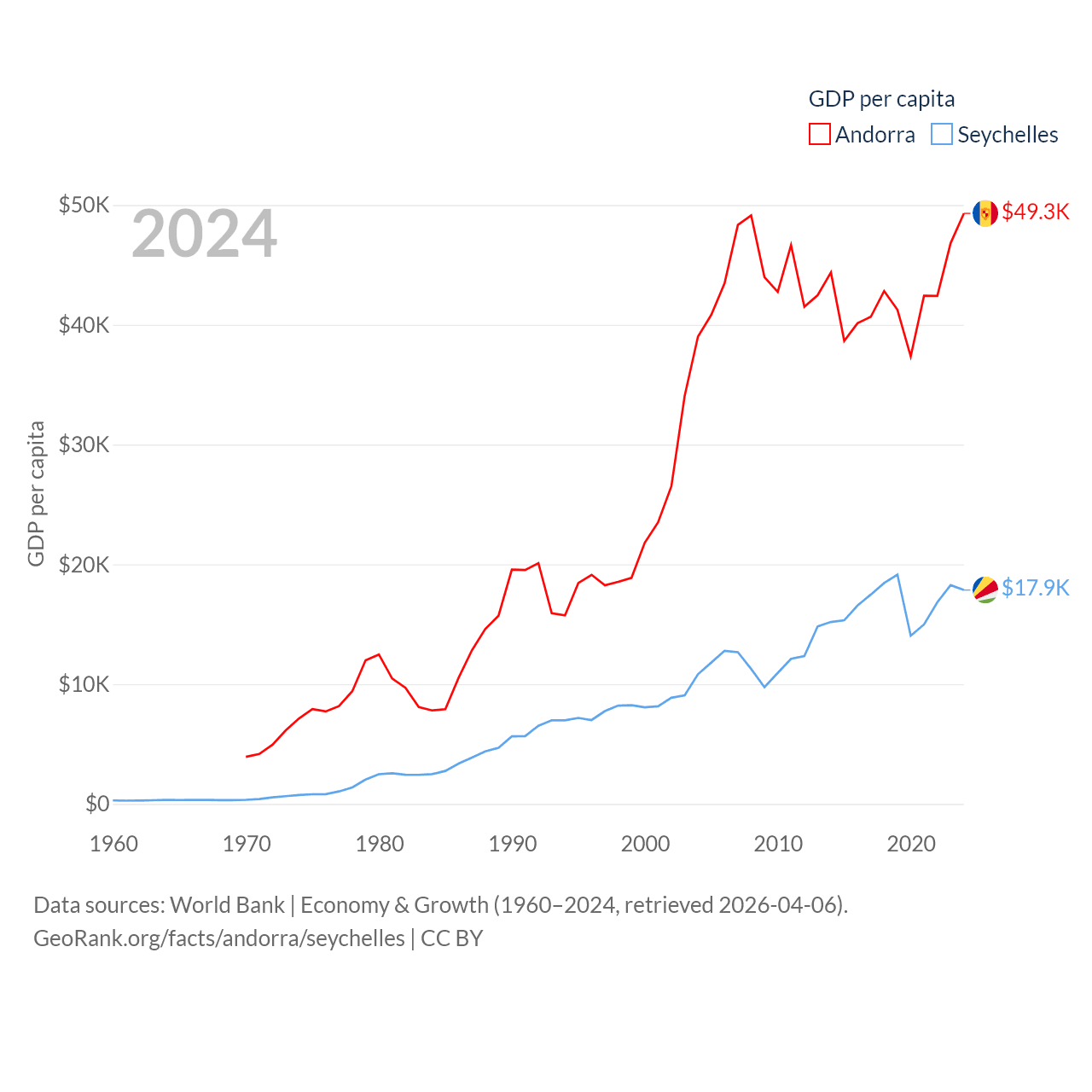 By GDP, Andorra ranks 166/197 ($4.04B) and The Seychelles ranks 178/197 ($2.17B). By GDP per capita, Andorra ranks 25/197 ($49,304), while The Seychelles ranks 63/197 ($17,859).