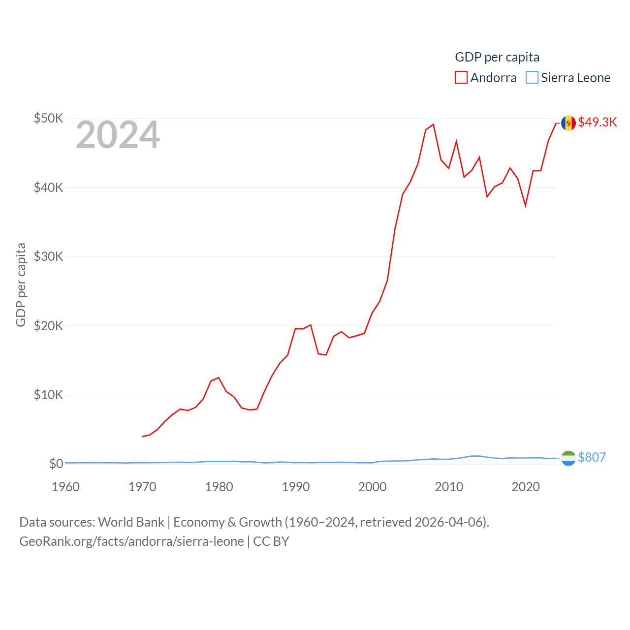 By GDP, Andorra ranks 166/197 ($4.04B) and Sierra Leone ranks 160/197 ($6.97B). By GDP per capita, Andorra ranks 25/197 ($49,304), while Sierra Leone ranks 186/197 ($807).