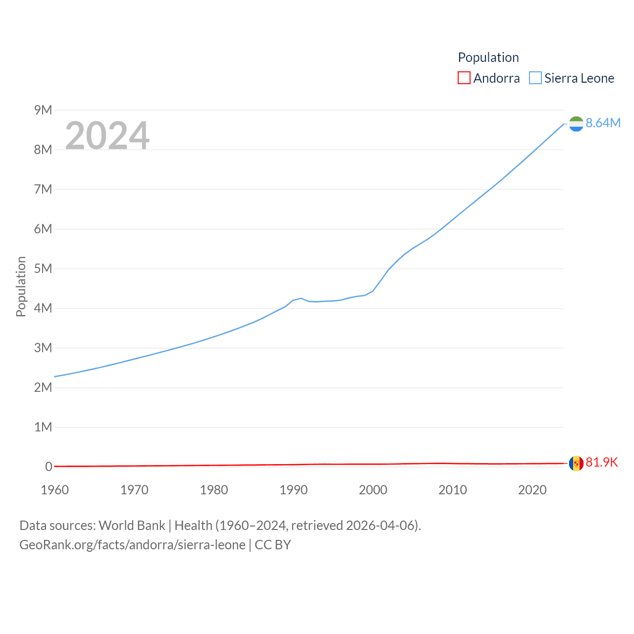 Andorra has a population of 81.9K (ranked 186/197), compared with 8.64M in Sierra Leone (ranked 102/197). Andorra's land area is 181.5 sq mi versus 27,869 sq mi for Sierra Leone (ranked 179th vs. 116th).