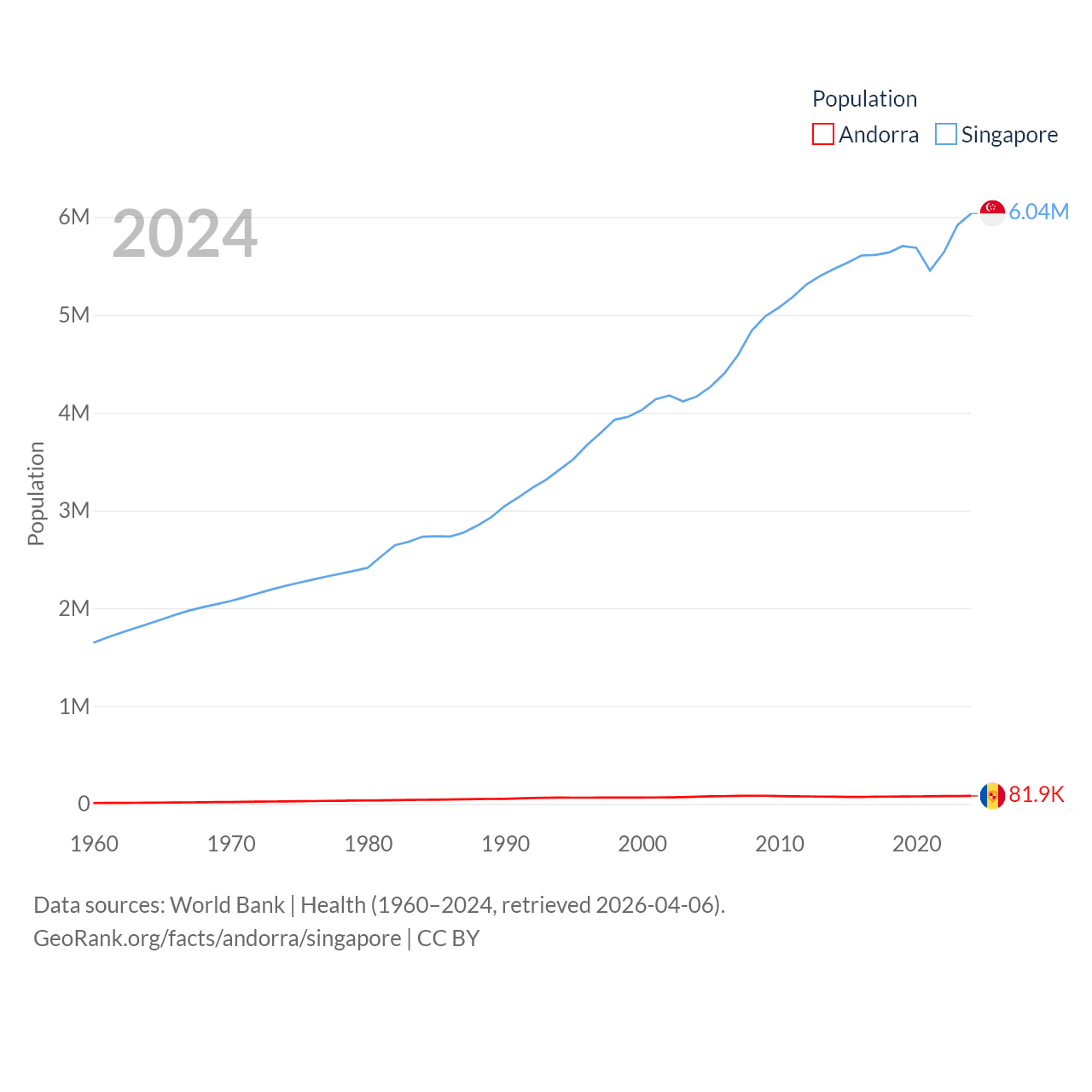 Andorra has a population of 81.9K (ranked 186/197), compared with 6.04M in Singapore (ranked 113/197). Andorra's land area is 181.5 sq mi versus 277.2 sq mi for Singapore (ranked 179th vs. 177th).