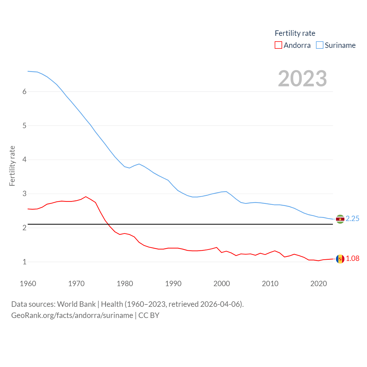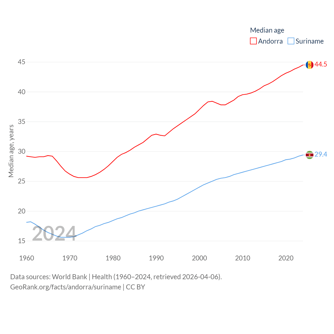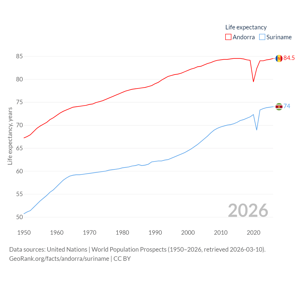 Andorra has a population of 81.9K (ranked 186/197), compared with 634K in Suriname (ranked 165/197). Andorra's land area is 181.5 sq mi versus 61,972 sq mi for Suriname (ranked 179th vs. 90th).