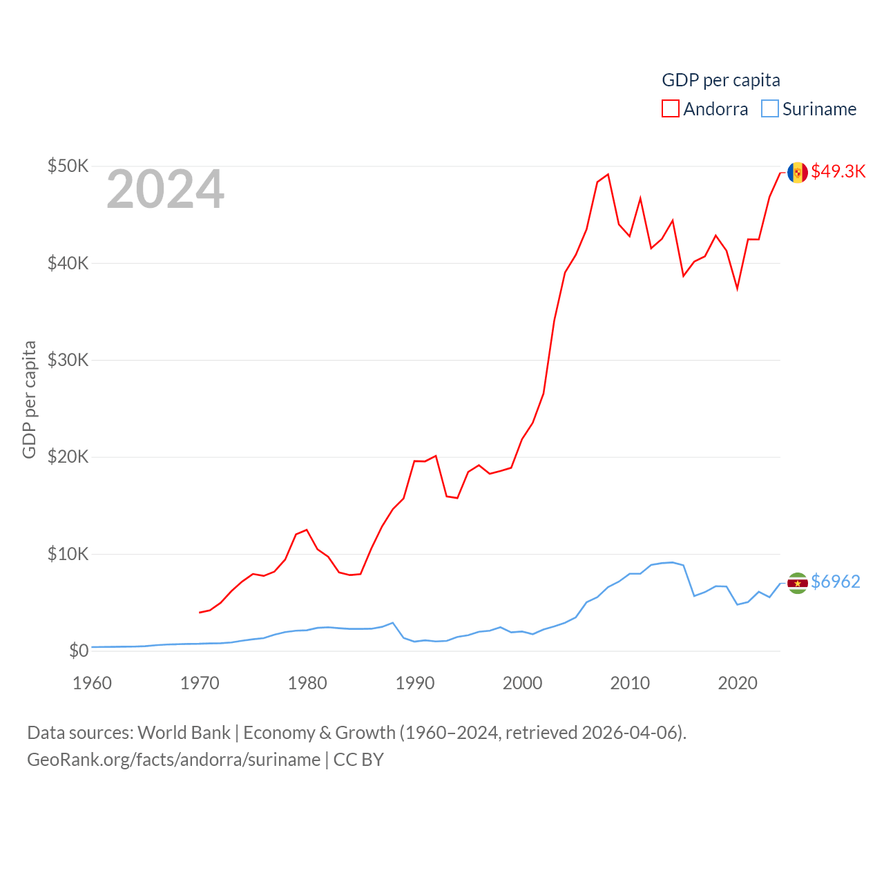 By GDP, Andorra ranks 166/197 ($4.04B) and Suriname ranks 164/197 ($4.42B). By GDP per capita, Andorra ranks 25/197 ($49,304), while Suriname ranks 102/197 ($6,962).