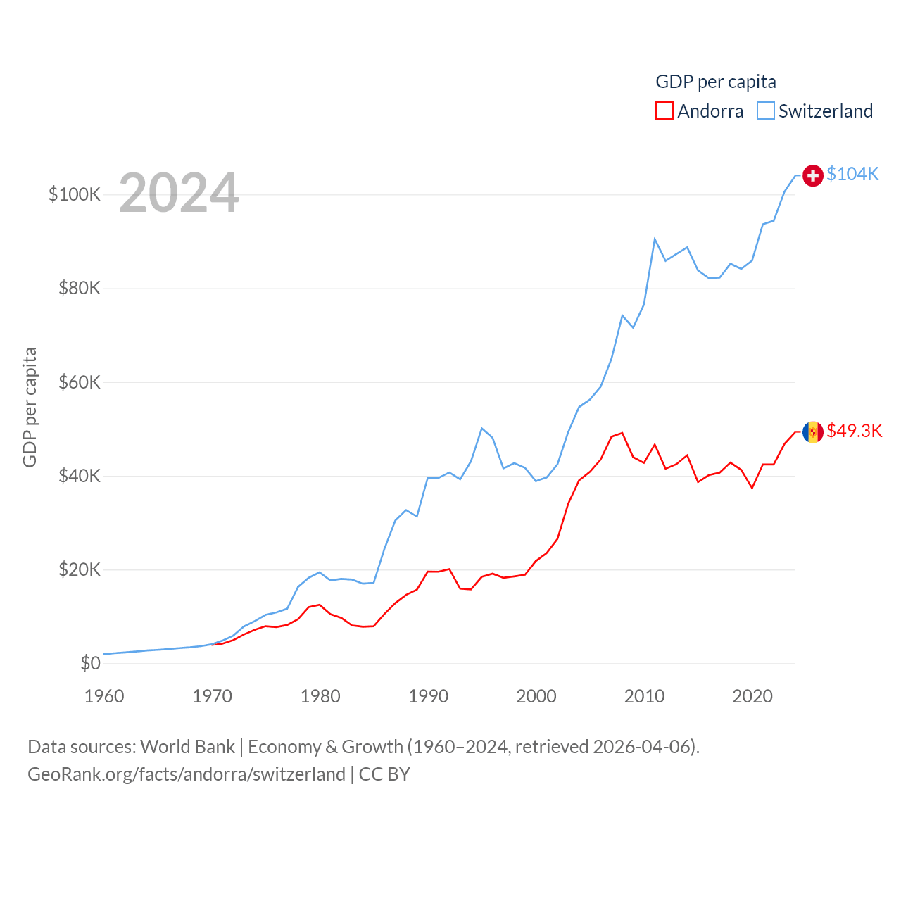 By GDP, Andorra ranks 166/197 ($4.04B) and Switzerland ranks 20/197 ($937B). By GDP per capita, Andorra ranks 25/197 ($49,304), while Switzerland ranks 5/197 ($103,998).