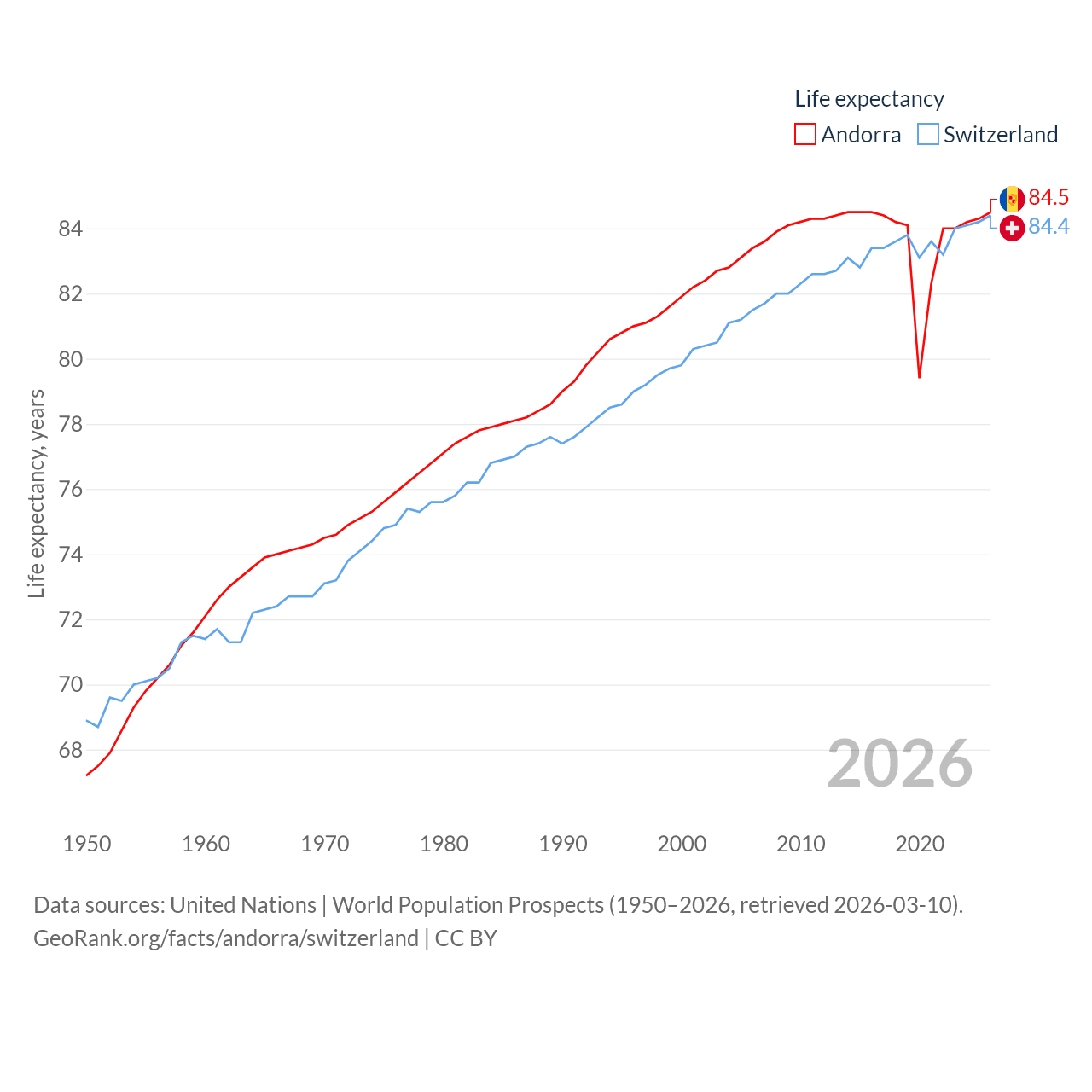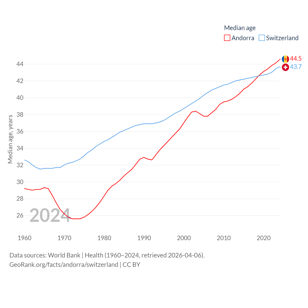 Andorra has a population of 81.9K (ranked 186/197), compared with 9.01M in Switzerland (ranked 101/197). Andorra's land area is 181.5 sq mi versus 15,255 sq mi for Switzerland (ranked 179th vs. 131st).