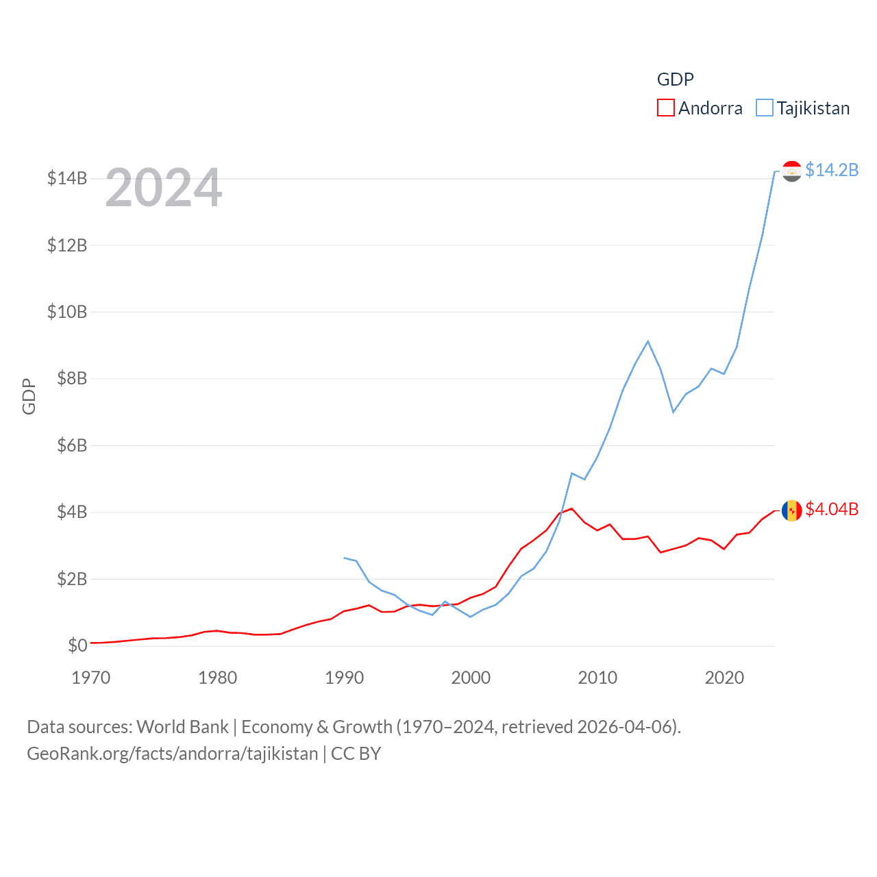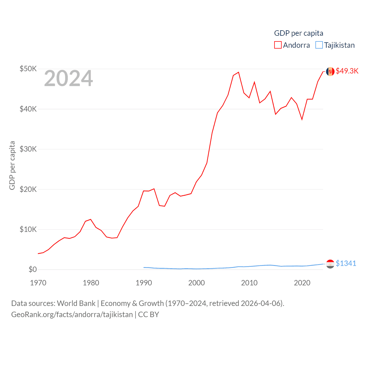 By GDP, Andorra ranks 166/197 ($4.04B) and Tajikistan ranks 145/197 ($14.2B). By GDP per capita, Andorra ranks 25/197 ($49,304), while Tajikistan ranks 166/197 ($1,341).
