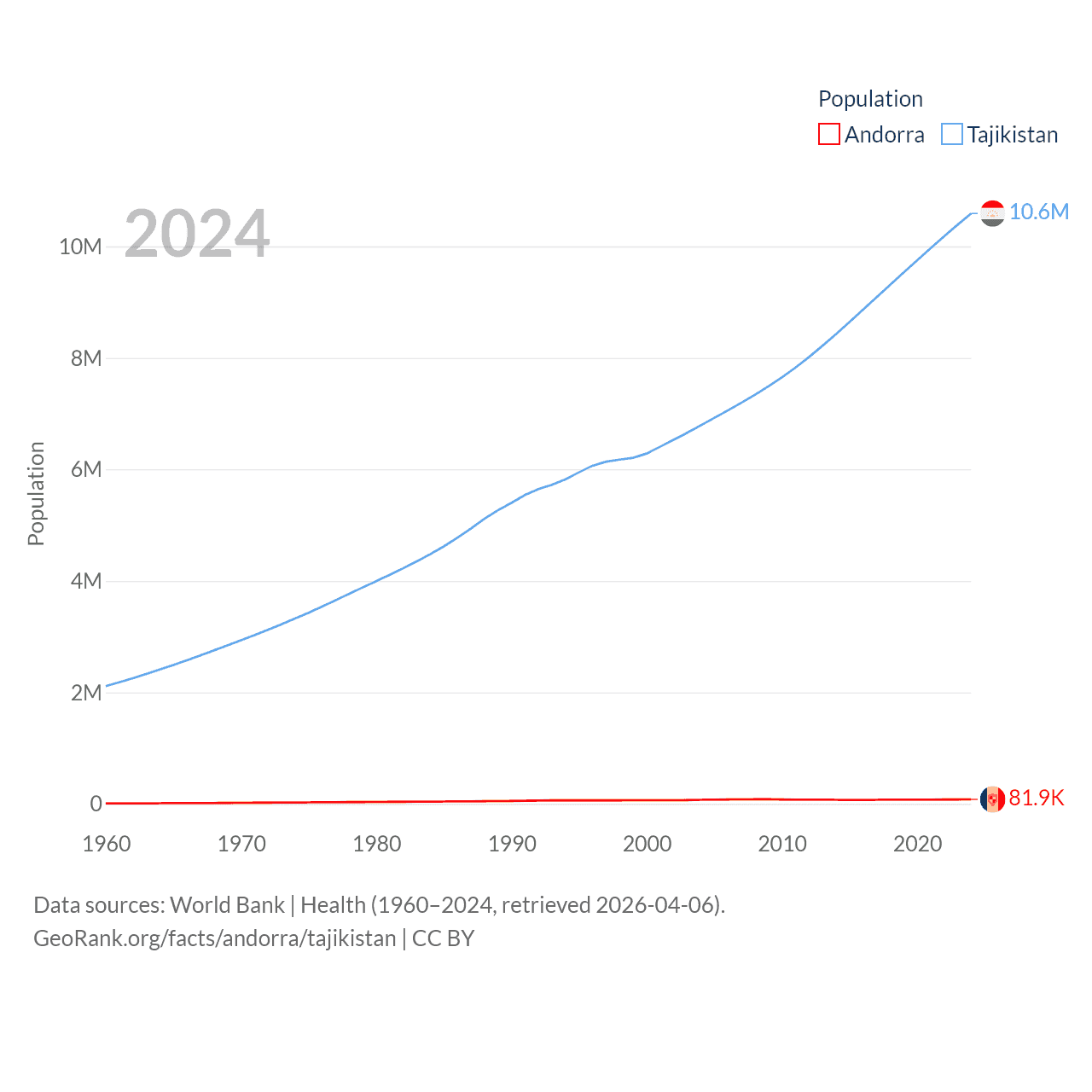 Andorra has a population of 81.9K (ranked 186/197), compared with 10.6M in Tajikistan (ranked 91/197). Andorra's land area is 181.5 sq mi versus 53,587 sq mi for Tajikistan (ranked 179th vs. 93rd).