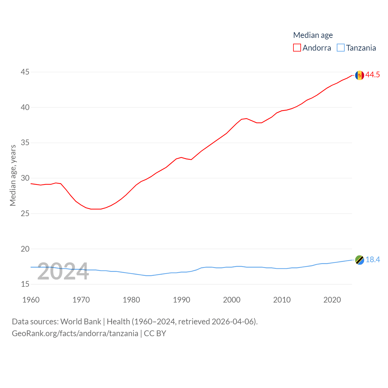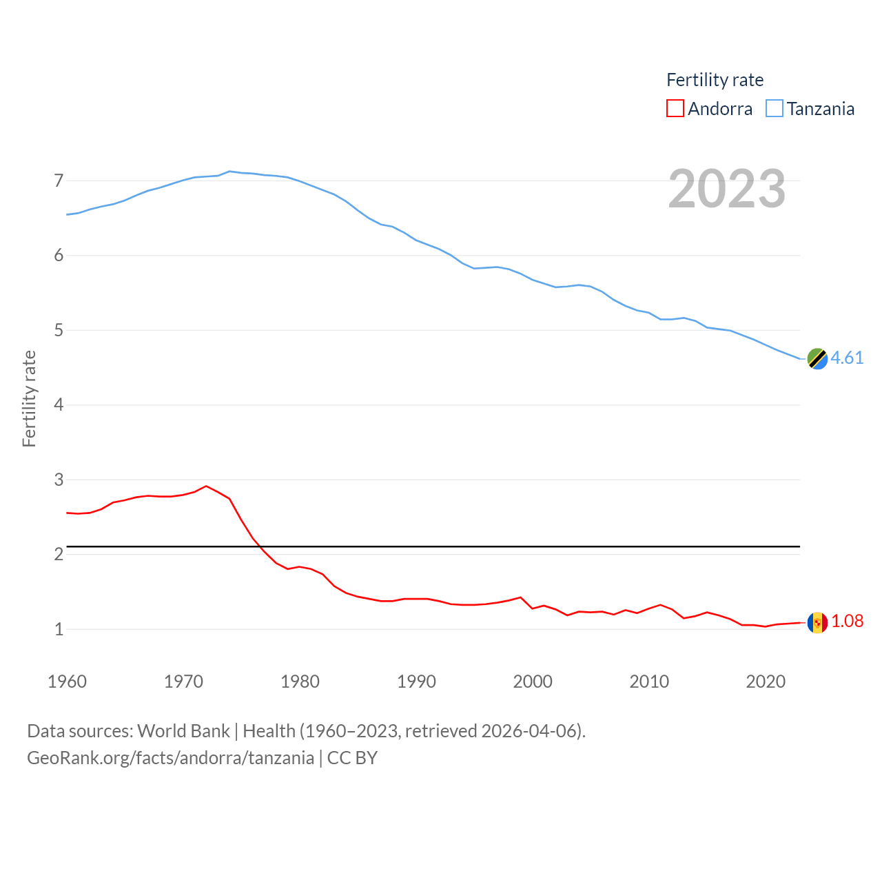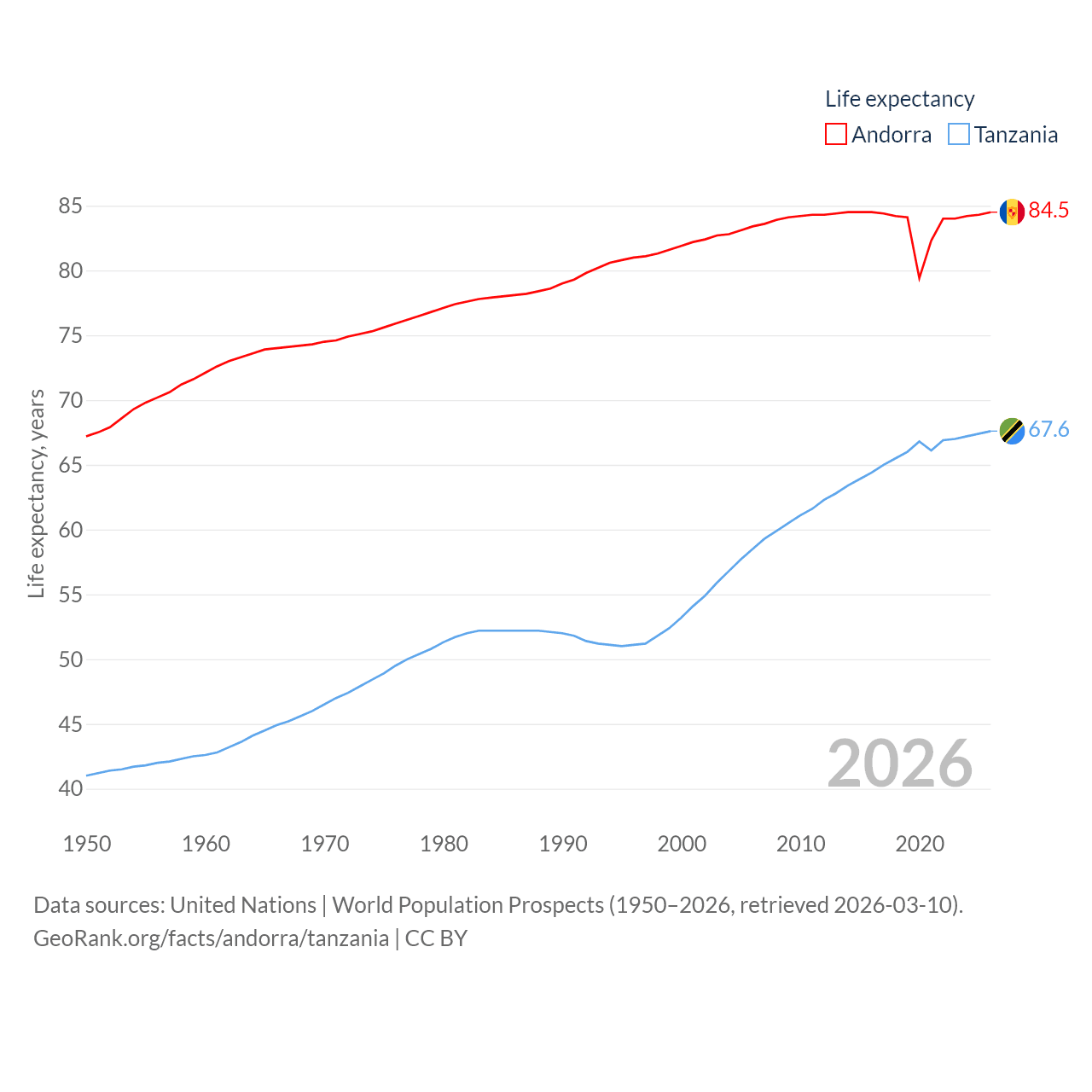Andorra has a population of 81.9K (ranked 186/197), compared with 68.6M in Tanzania (ranked 22/197). Andorra's land area is 181.5 sq mi versus 342,009 sq mi for Tanzania (ranked 179th vs. 31st).