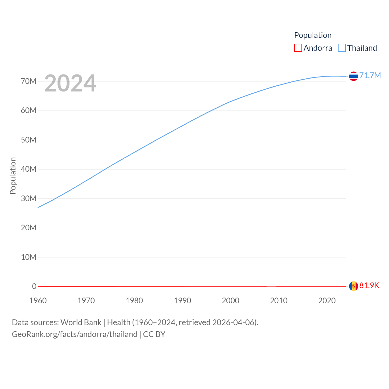 Andorra has a population of 81.9K (ranked 186/197), compared with 71.7M in Thailand (ranked 20/197). Andorra's land area is 181.5 sq mi versus 197,256 sq mi for Thailand (ranked 179th vs. 50th).