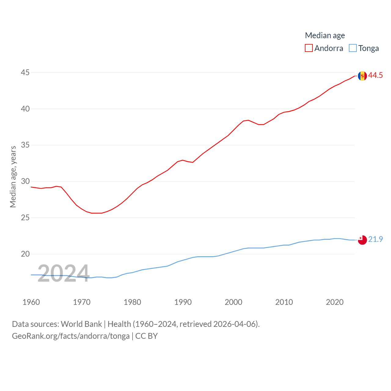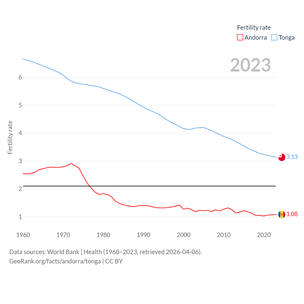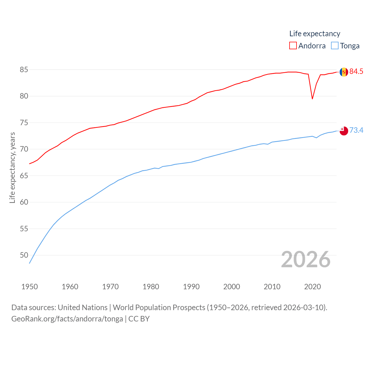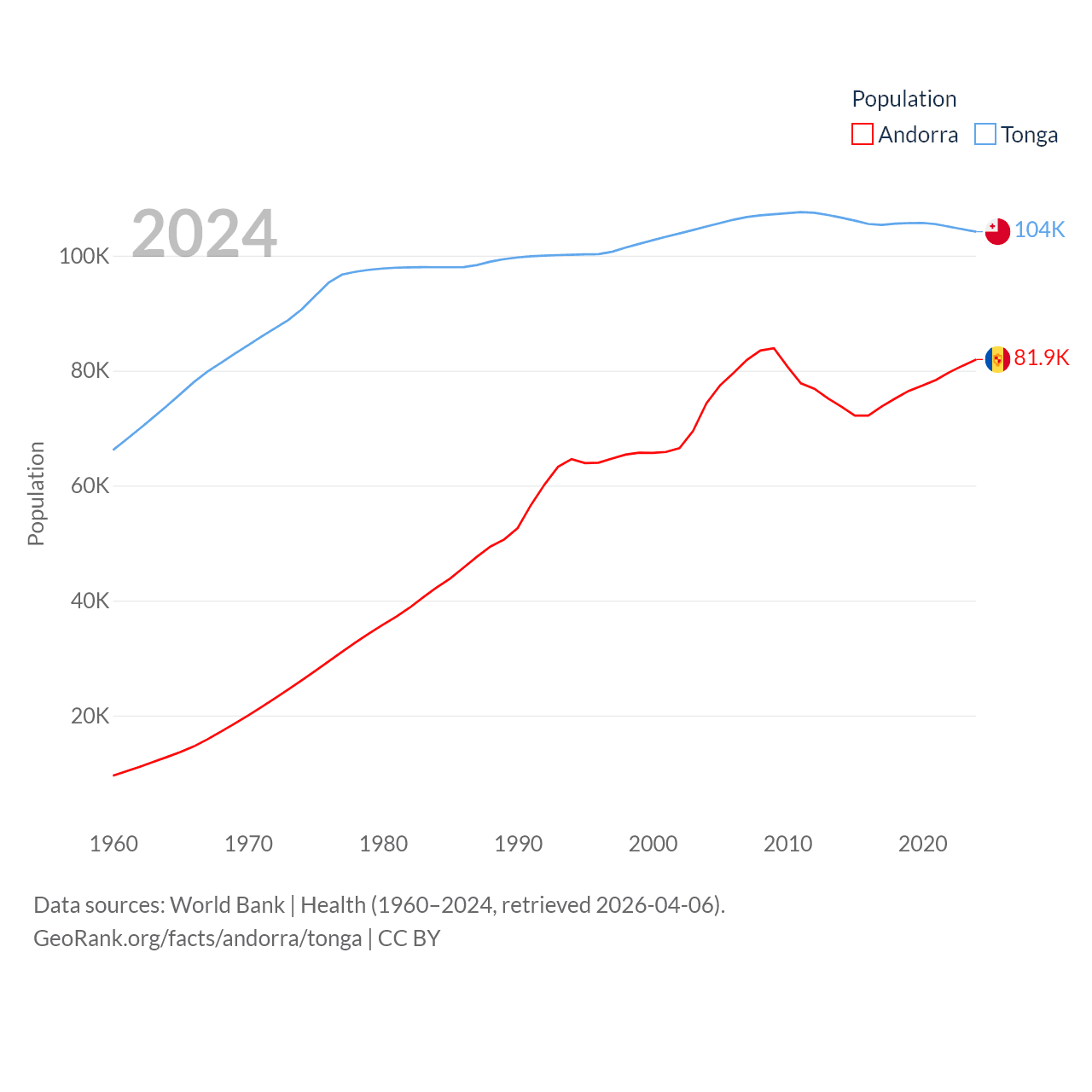 Andorra has a population of 81.9K (ranked 186/197), compared with 104K in Tonga (ranked 183/197). Andorra's land area is 181.5 sq mi versus 278 sq mi for Tonga (ranked 179th vs. 176th).