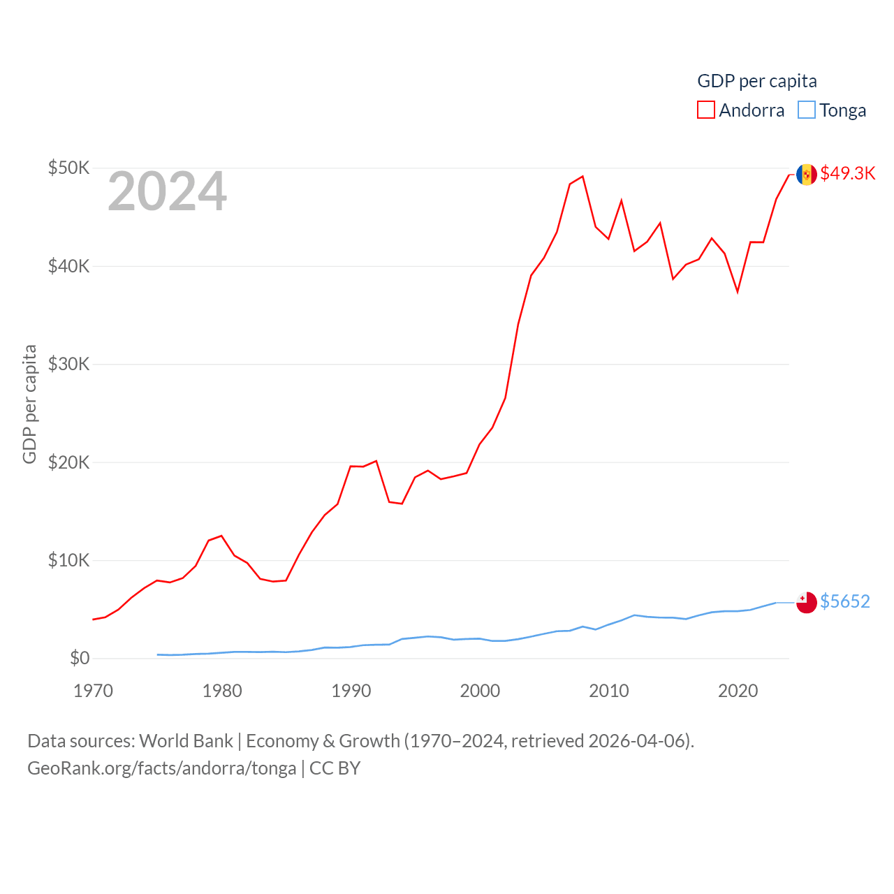 By GDP, Andorra ranks 166/197 ($4.04B) and Tonga ranks 191/197 ($591M). By GDP per capita, Andorra ranks 25/197 ($49,304), while Tonga ranks 115/197 ($5,652).