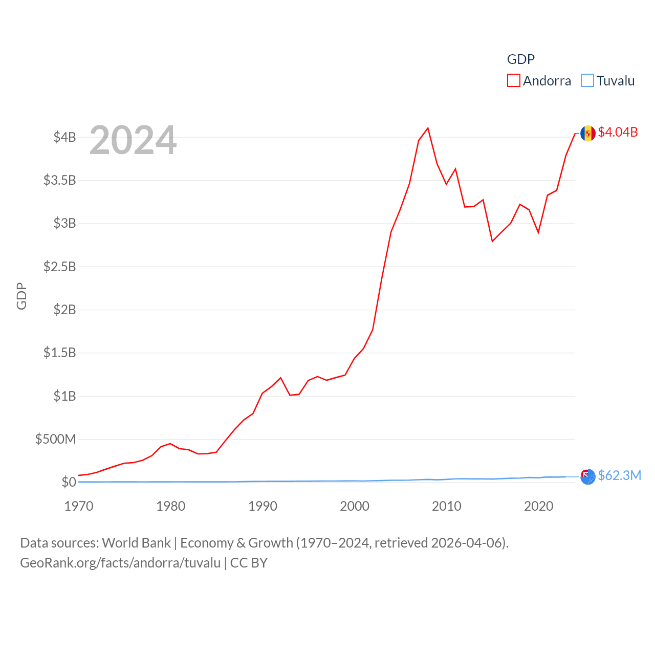 By GDP, Andorra ranks 166/197 ($4.04B) and Tuvalu ranks 196/197 ($62.3M). By GDP per capita, Andorra ranks 25/197 ($49,304), while Tuvalu ranks 110/197 ($6,345).