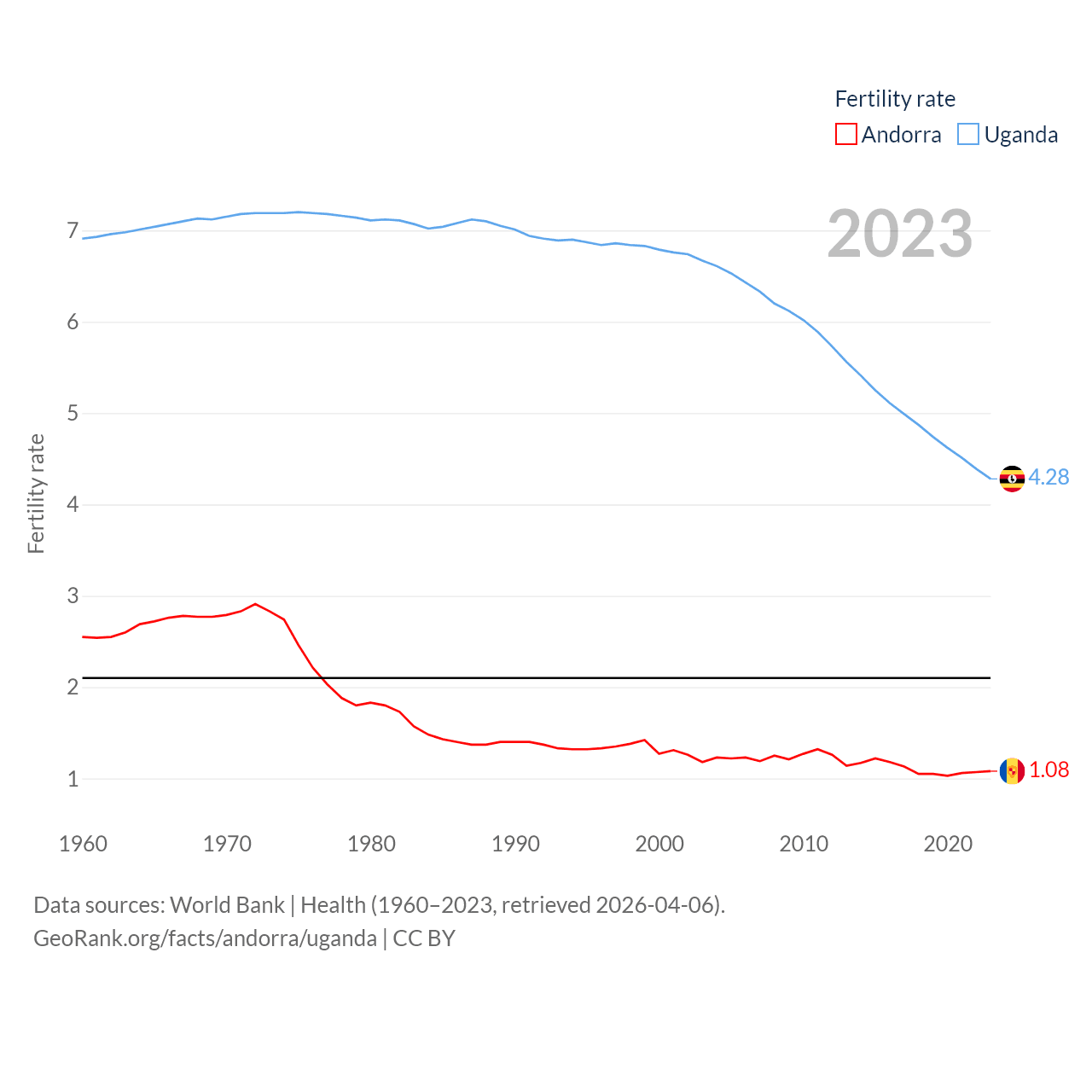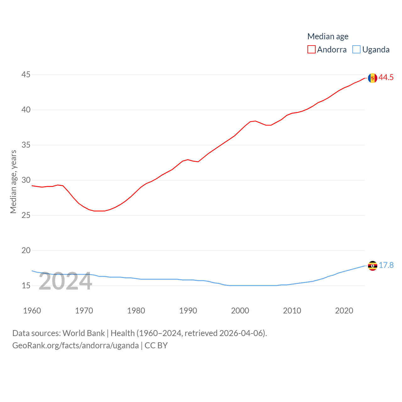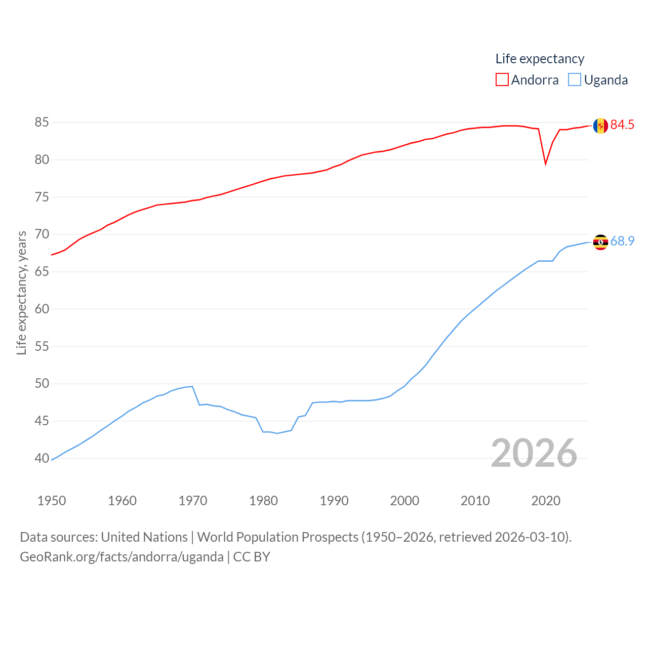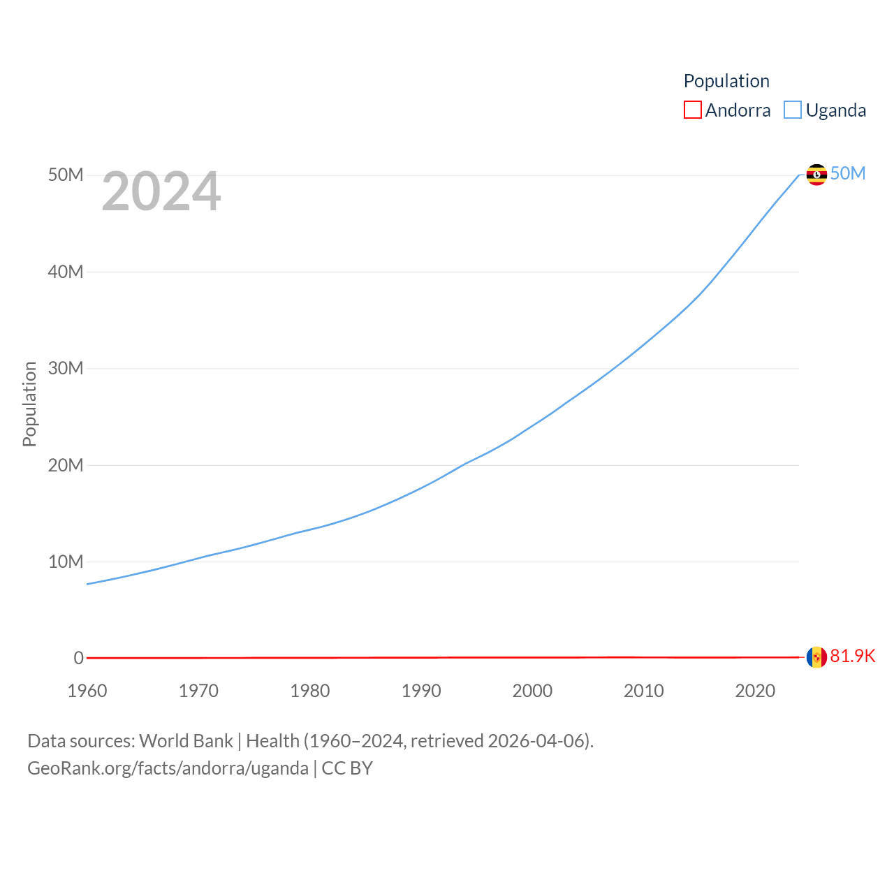 Andorra has a population of 81.9K (ranked 186/197), compared with 50M in Uganda (ranked 31/197). Andorra's land area is 181.5 sq mi versus 77,421 sq mi for Uganda (ranked 179th vs. 84th).