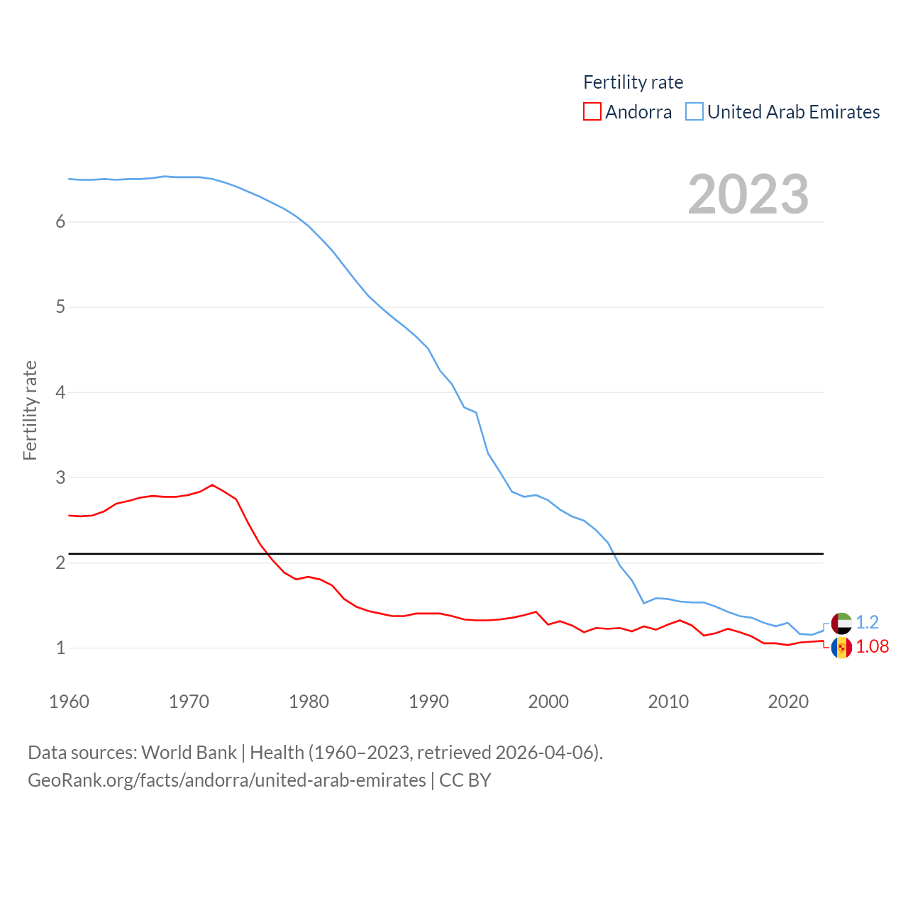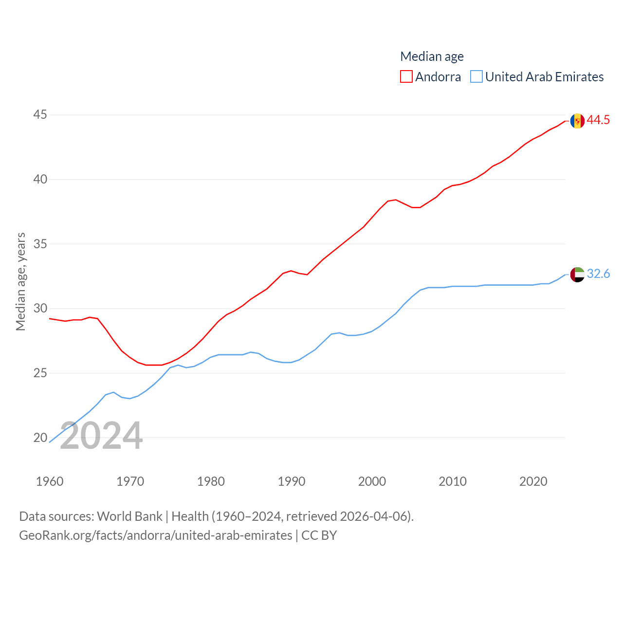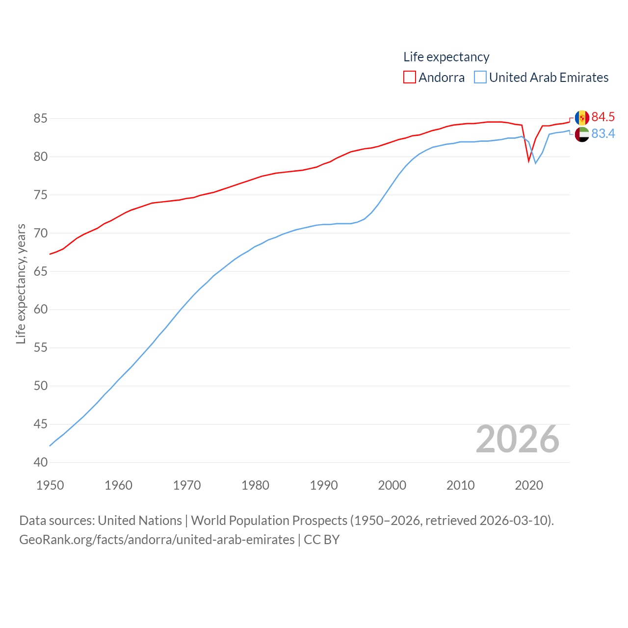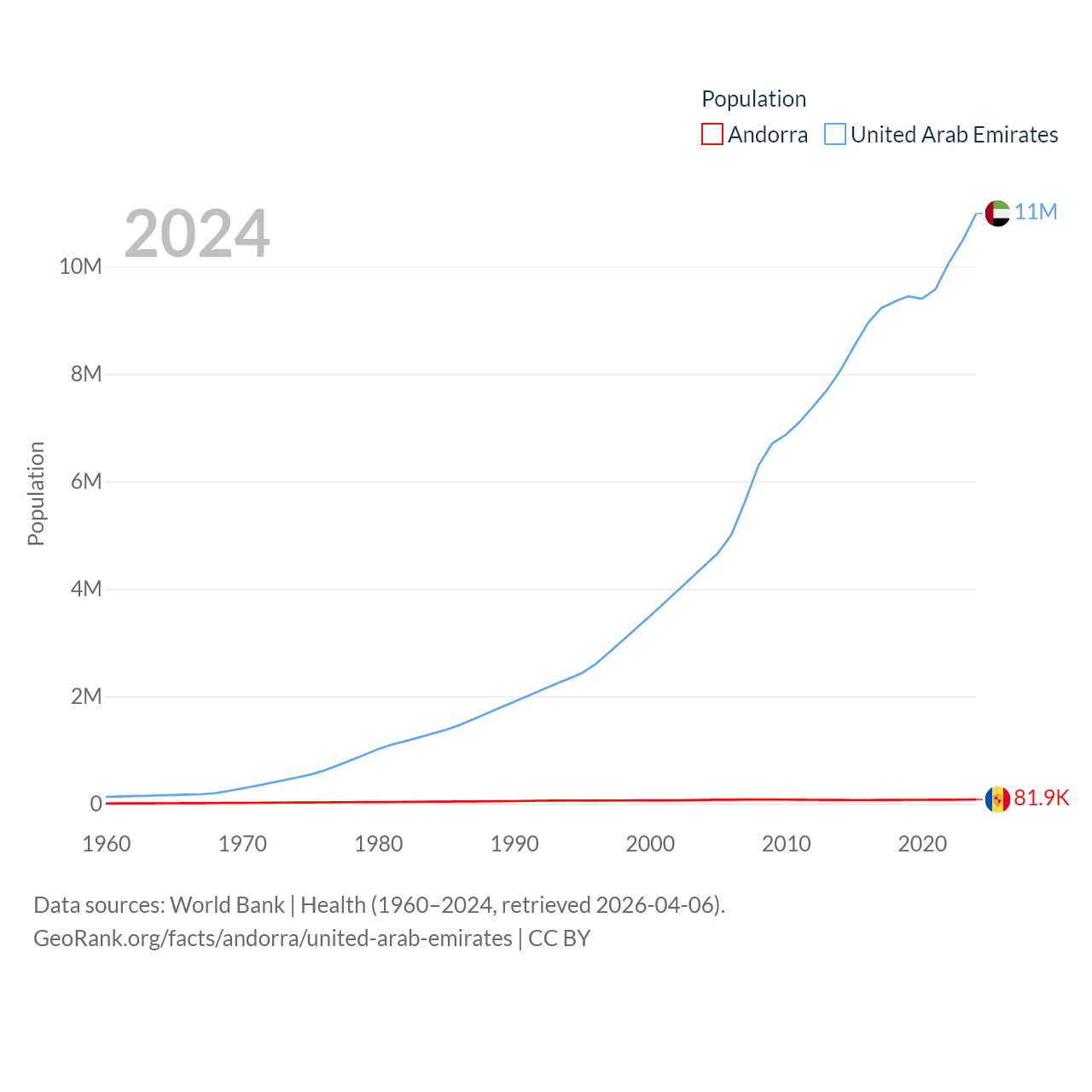 Andorra has a population of 81.9K (ranked 186/197), compared with 11M in The United Arab Emirates (ranked 86/197). Andorra's land area is 181.5 sq mi versus 27,421 sq mi for The United Arab Emirates (ranked 179th vs. 117th).