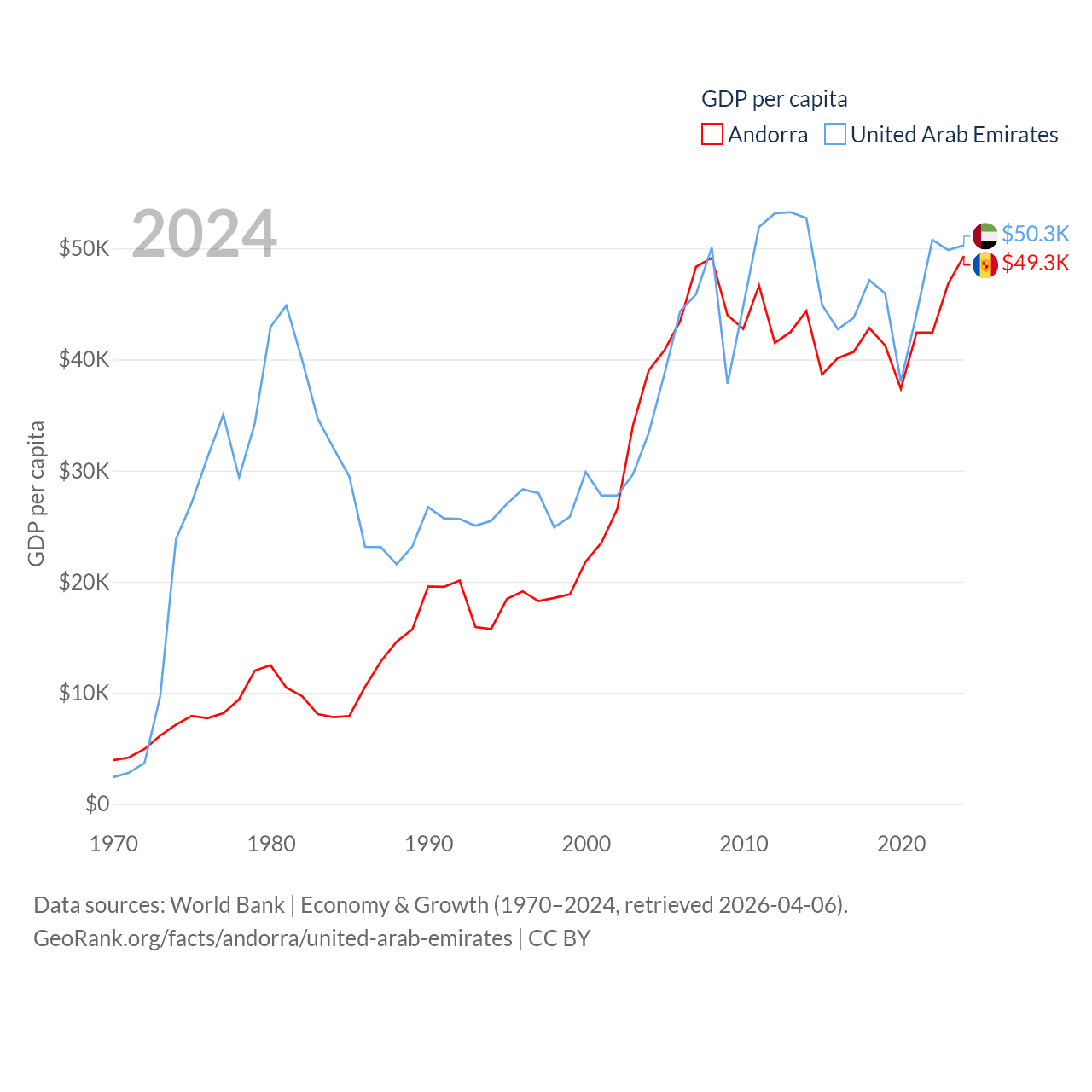 By GDP, Andorra ranks 166/197 ($4.04B) and The United Arab Emirates ranks 27/197 ($552B). By GDP per capita, Andorra ranks 25/197 ($49,304), while The United Arab Emirates ranks 24/197 ($50,274).