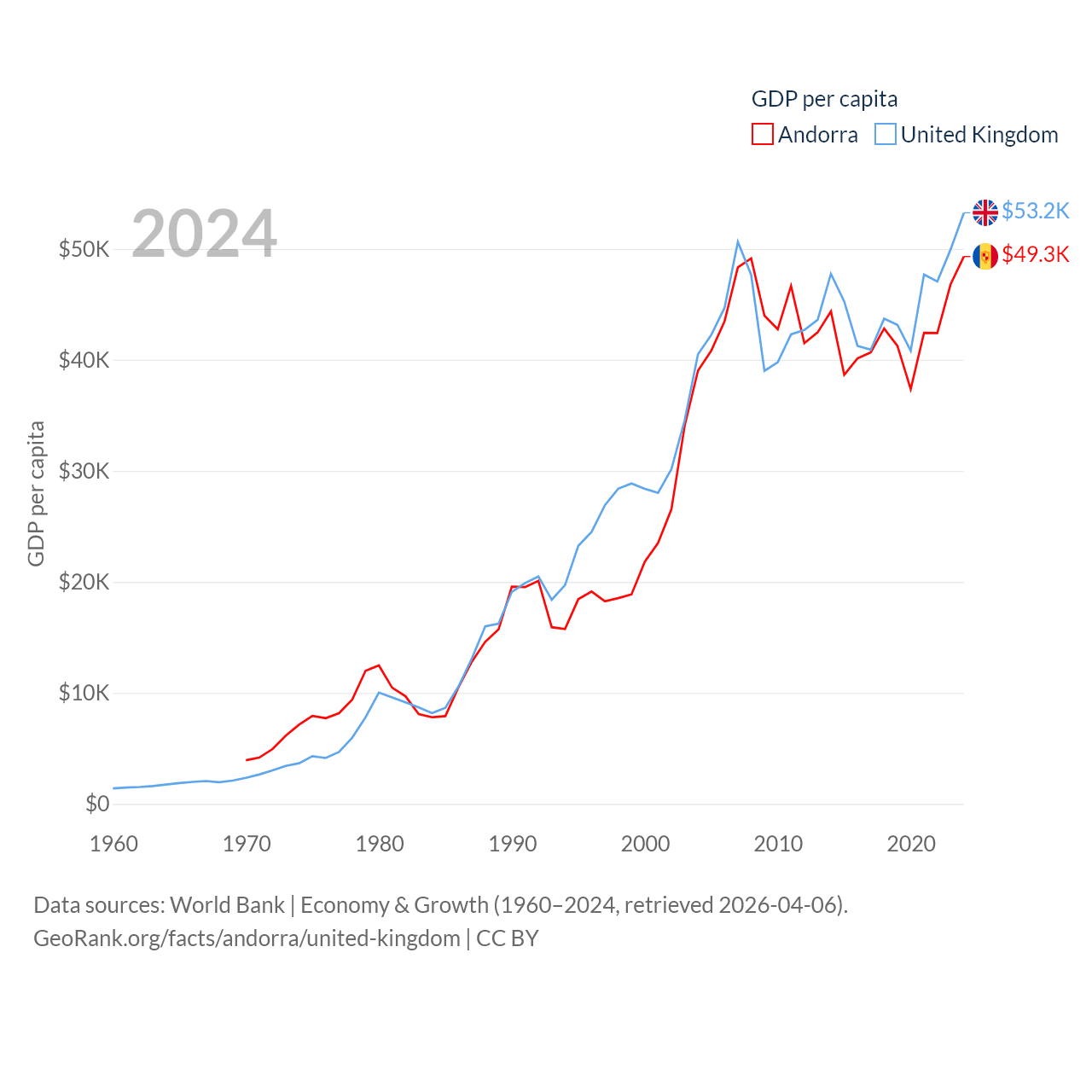 By GDP, Andorra ranks 166/197 ($4.04B) and The United Kingdom ranks 6/197 ($3.69T). By GDP per capita, Andorra ranks 25/197 ($49,304), while The United Kingdom ranks 22/197 ($53,246).