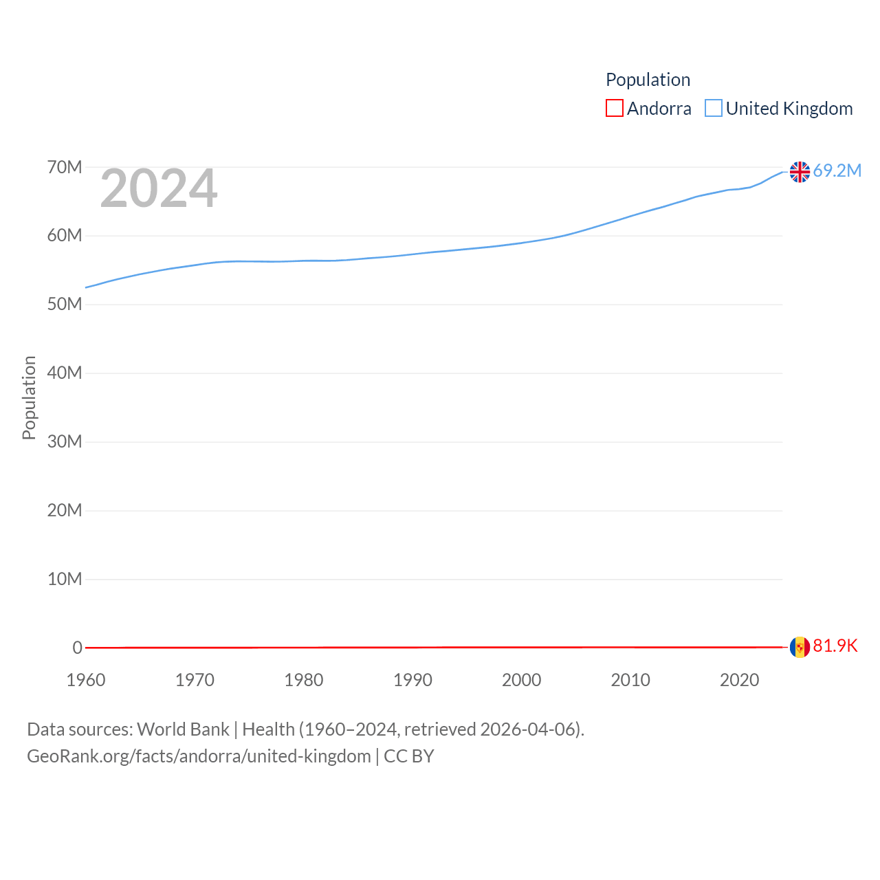 Andorra has a population of 81.9K (ranked 186/197), compared with 69.2M in The United Kingdom (ranked 21/197). Andorra's land area is 181.5 sq mi versus 93,410 sq mi for The United Kingdom (ranked 179th vs. 78th).