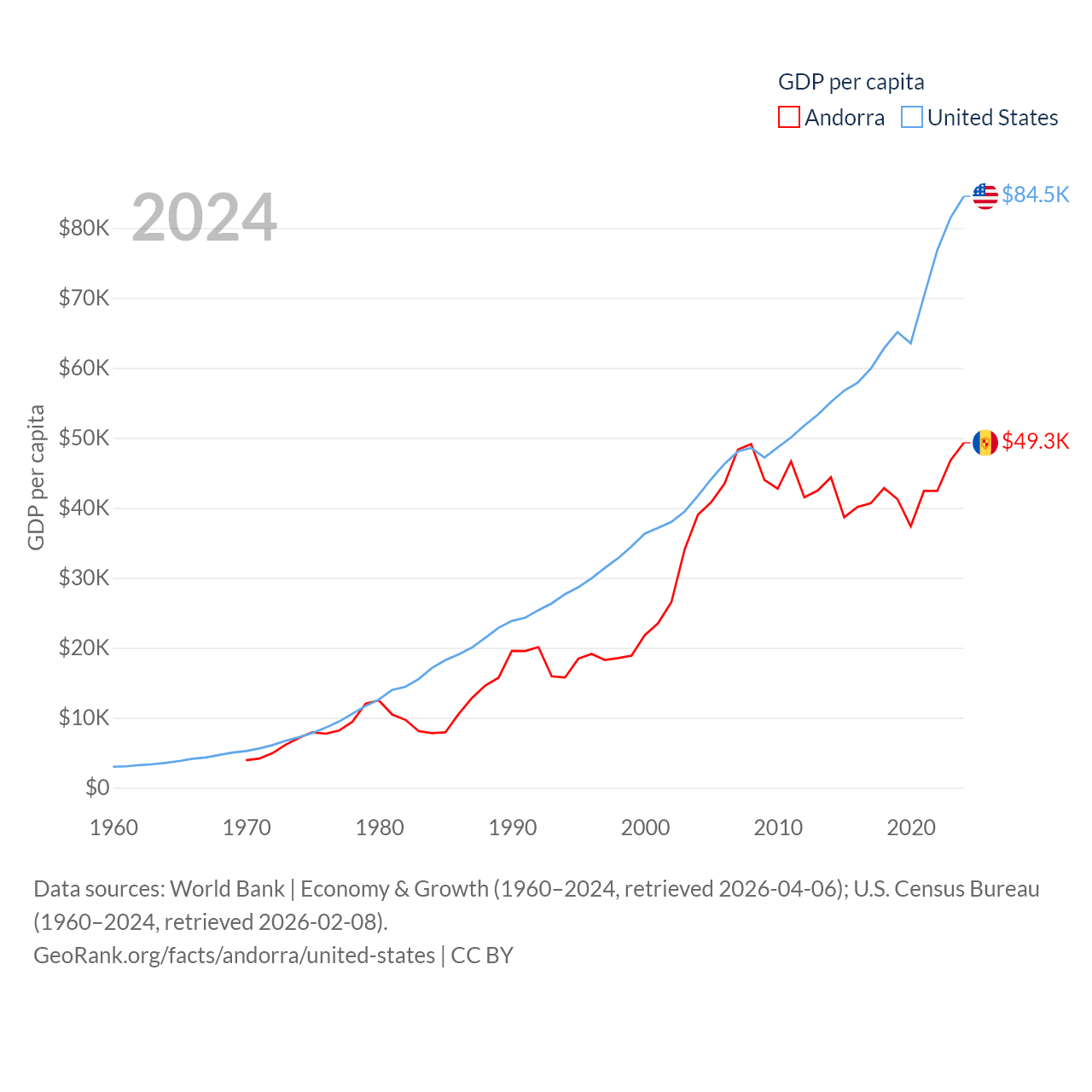 By GDP, Andorra ranks 166/197 ($4.04B) and The United States ranks 1/197 ($28.8T). By GDP per capita, Andorra ranks 25/197 ($49,304), while The United States ranks 10/197 ($84,534).