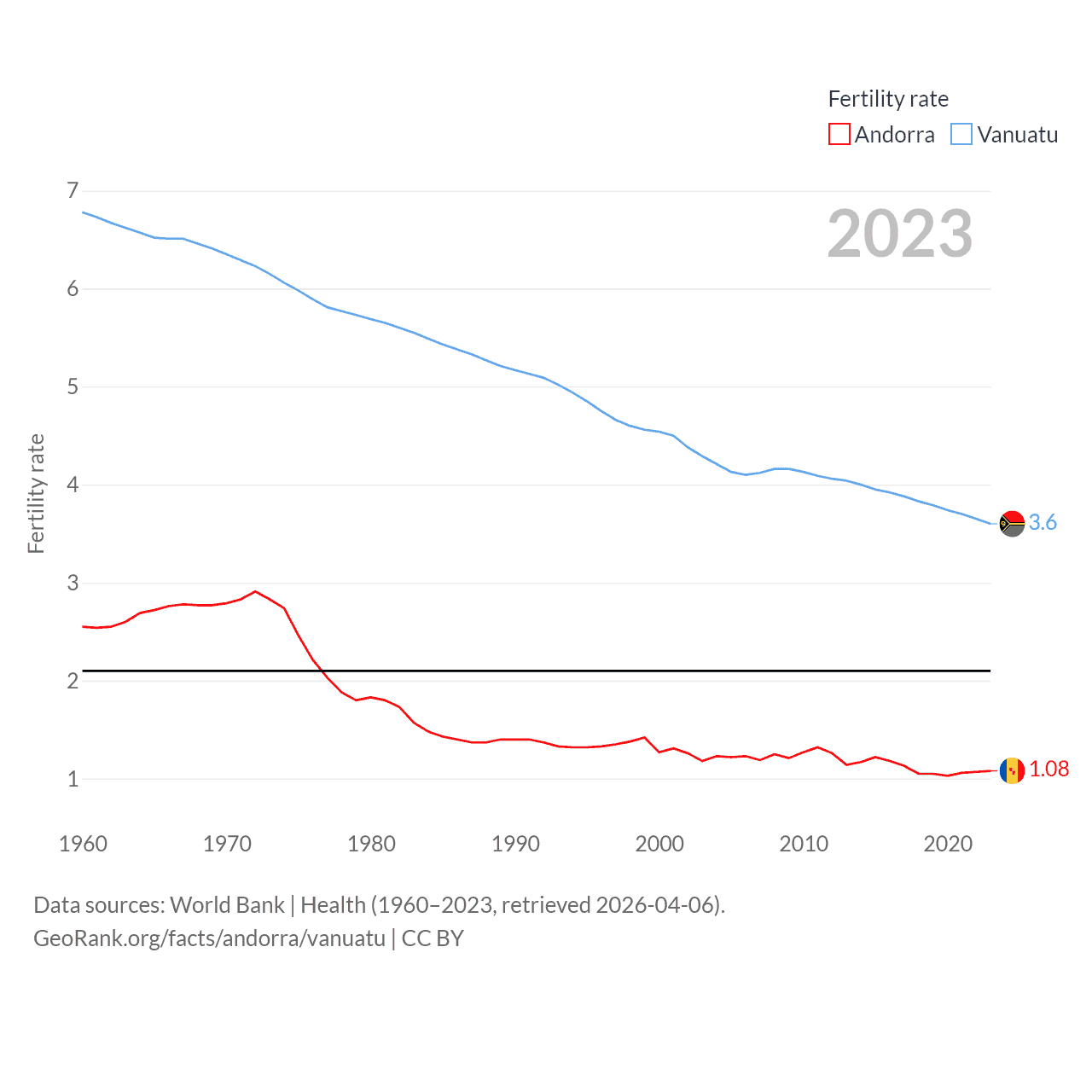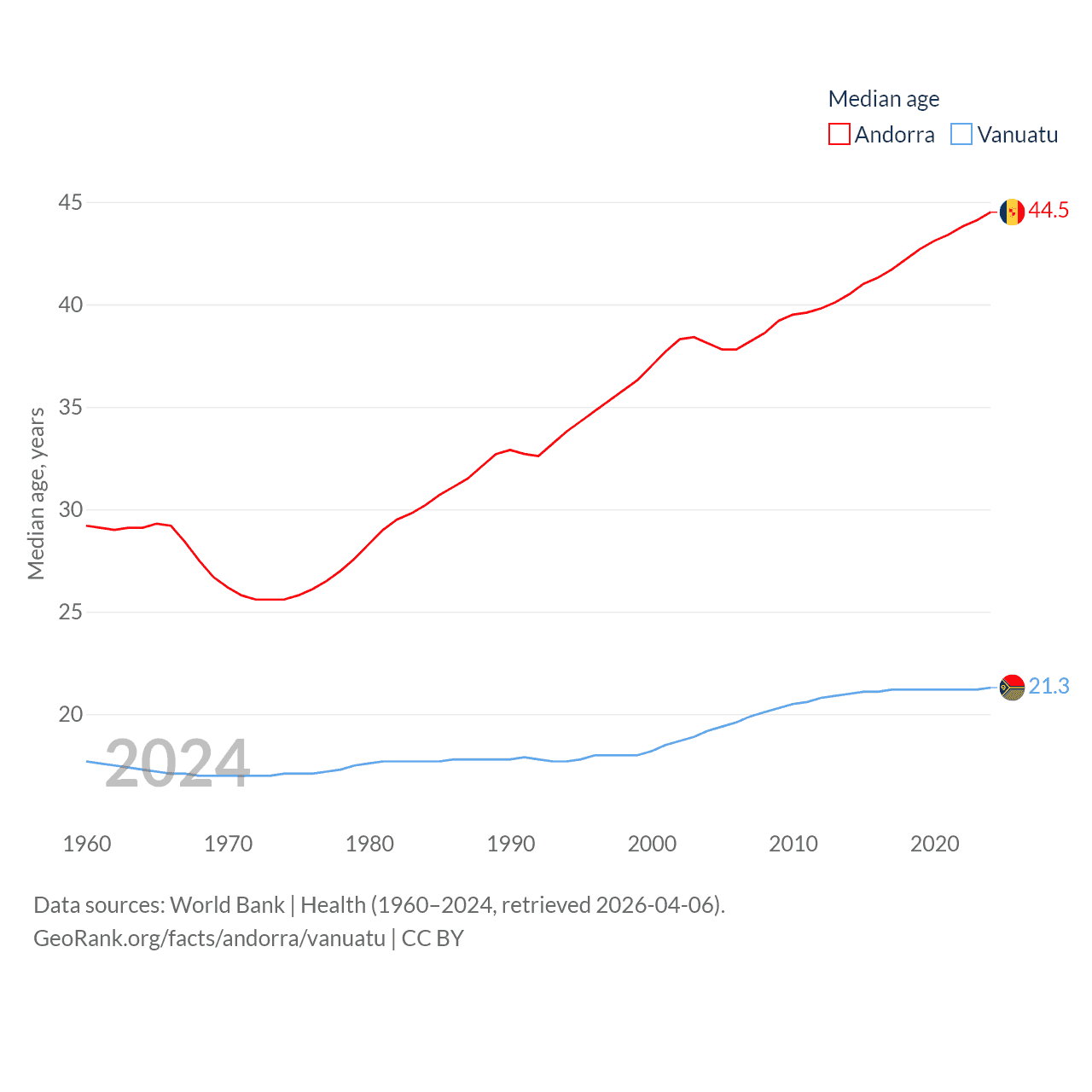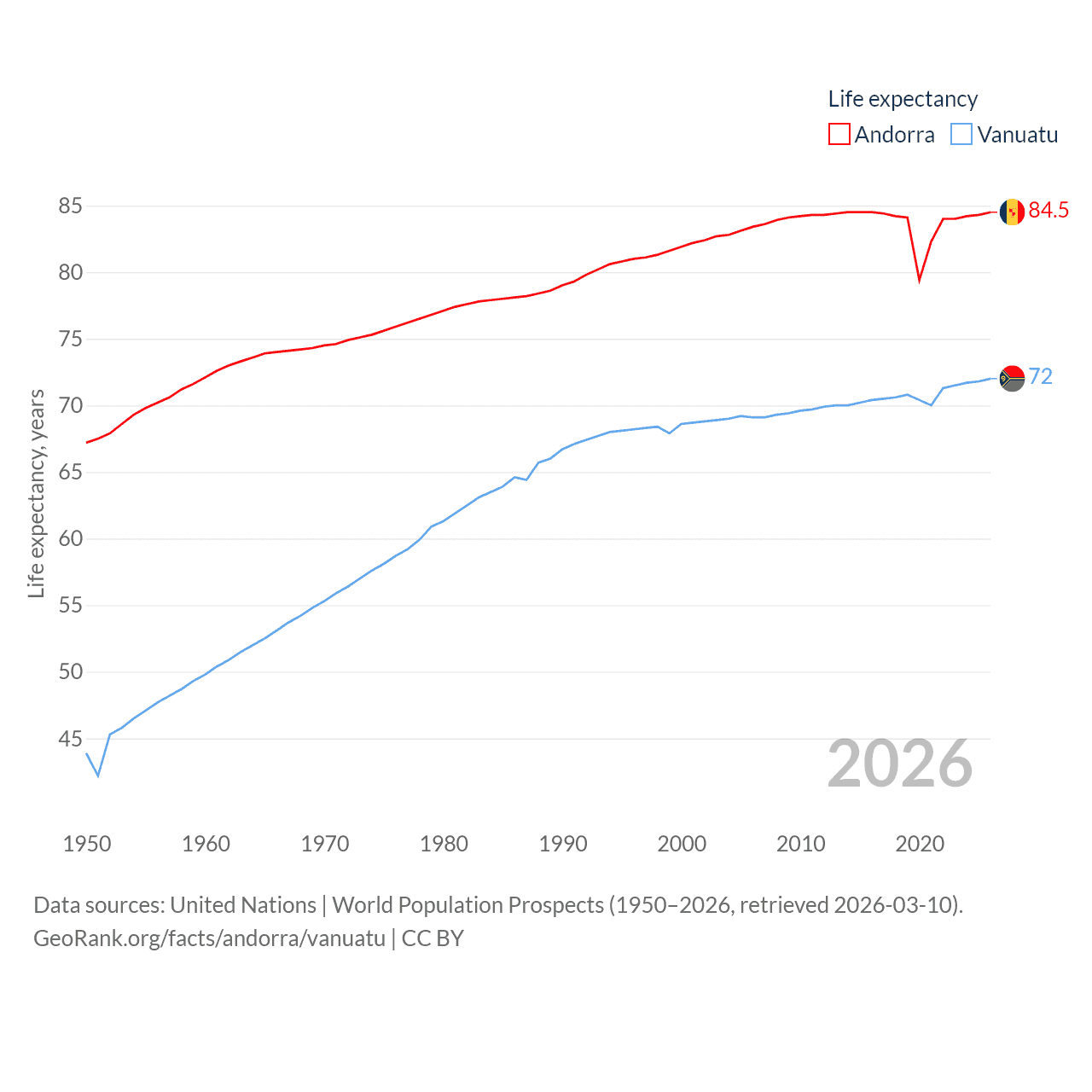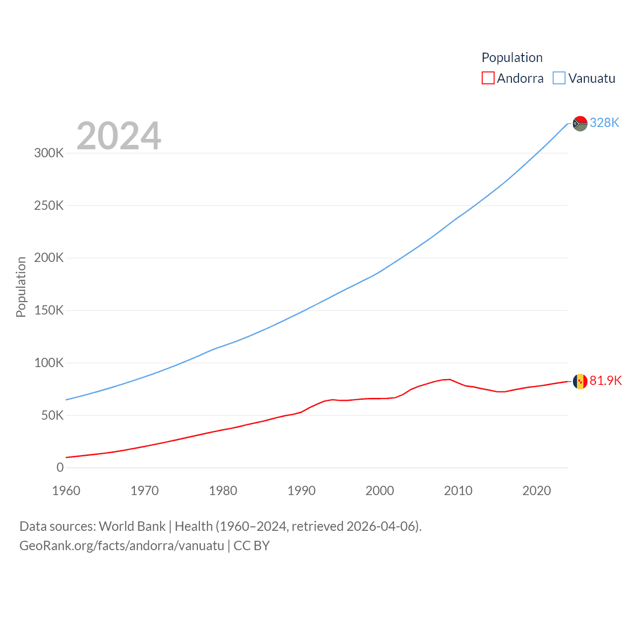 Andorra has a population of 81.9K (ranked 186/197), compared with 328K in Vanuatu (ranked 174/197). Andorra's land area is 181.5 sq mi versus 4,707 sq mi for Vanuatu (ranked 179th vs. 157th).