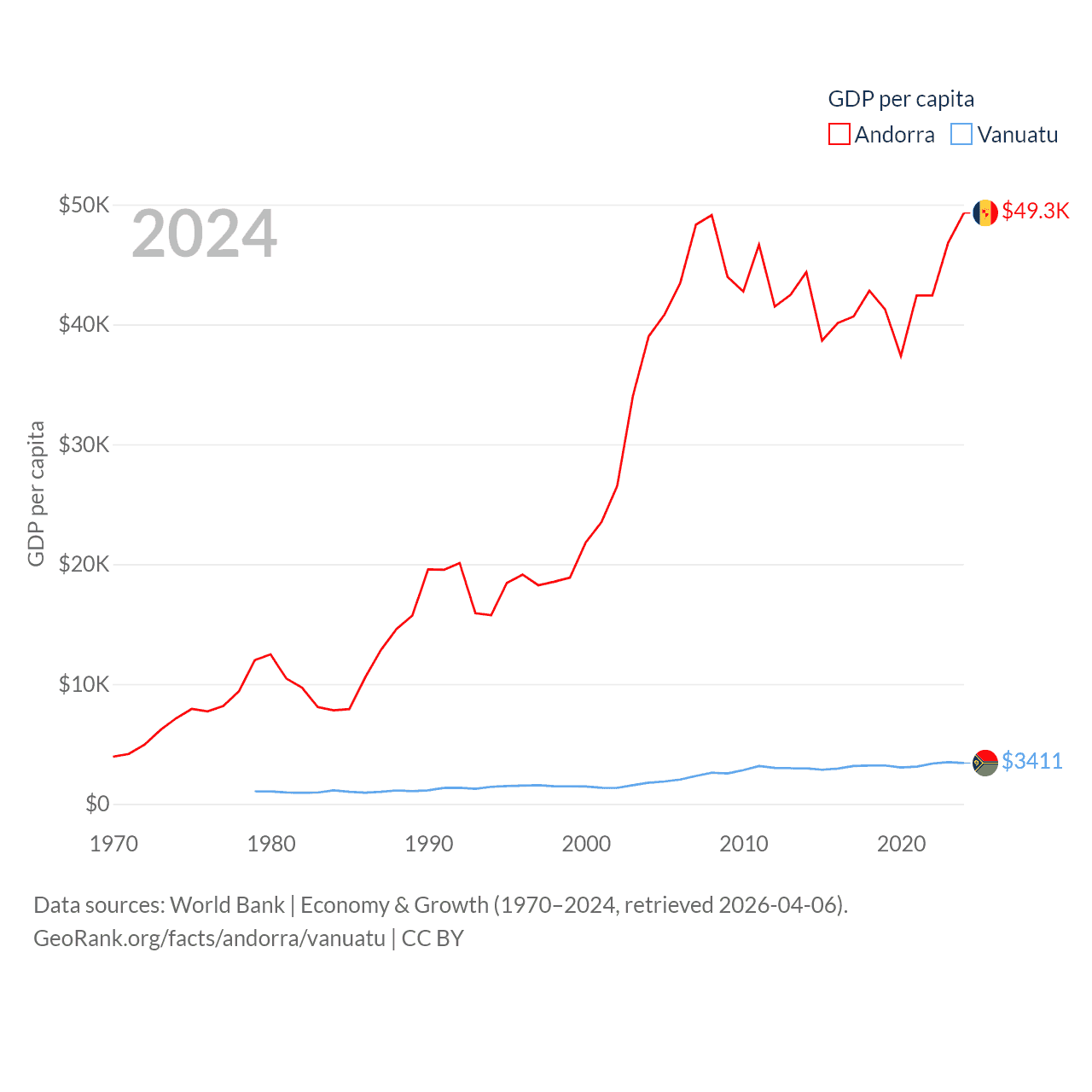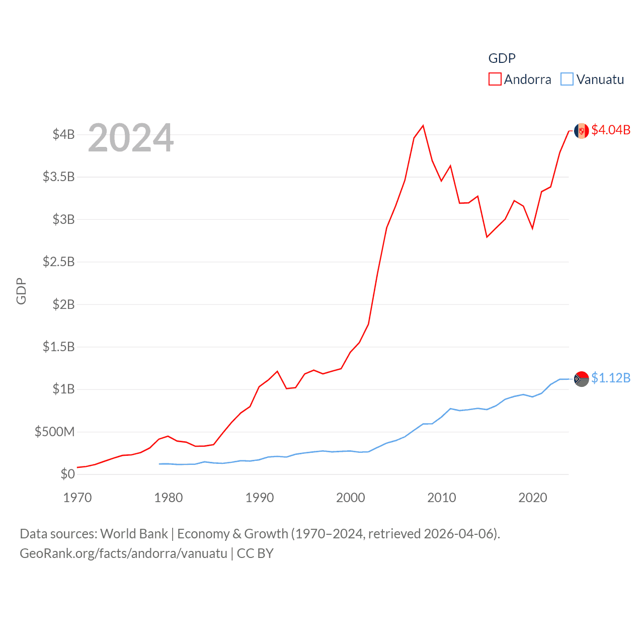 By GDP, Andorra ranks 166/197 ($4.04B) and Vanuatu ranks 188/197 ($1.12B). By GDP per capita, Andorra ranks 25/197 ($49,304), while Vanuatu ranks 137/197 ($3,411).