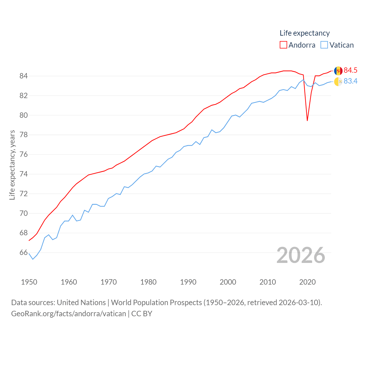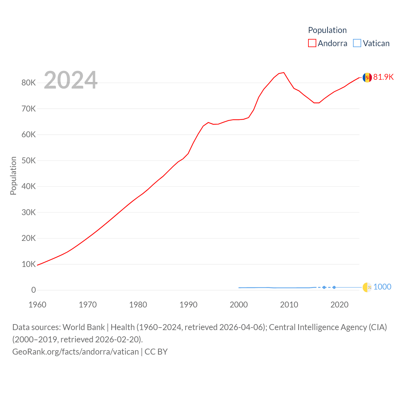Andorra has a population of 81.9K (ranked 186/197), compared with 1K in The Vatican (ranked 197/197). Andorra's land area is 181.5 sq mi versus 0.17 sq mi for The Vatican (ranked 179th vs. 197th).