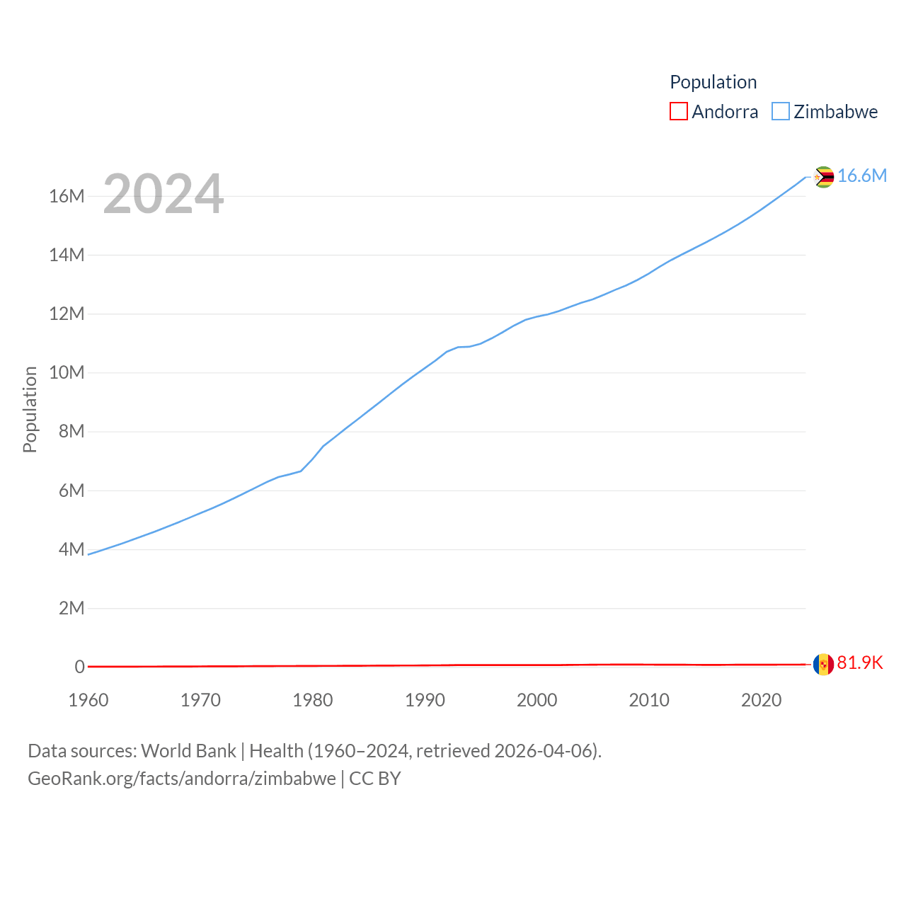 Andorra has a population of 81.9K (ranked 186/197), compared with 16.6M in Zimbabwe (ranked 74/197). Andorra's land area is 181.5 sq mi versus 149,364 sq mi for Zimbabwe (ranked 179th vs. 60th).