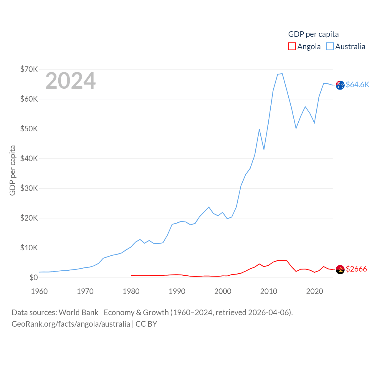 By GDP, Angola ranks 71/197 ($101B) and Australia ranks 14/197 ($1.76T). By GDP per capita, Angola ranks 144/197 ($2,666), while Australia ranks 14/197 ($64,604).