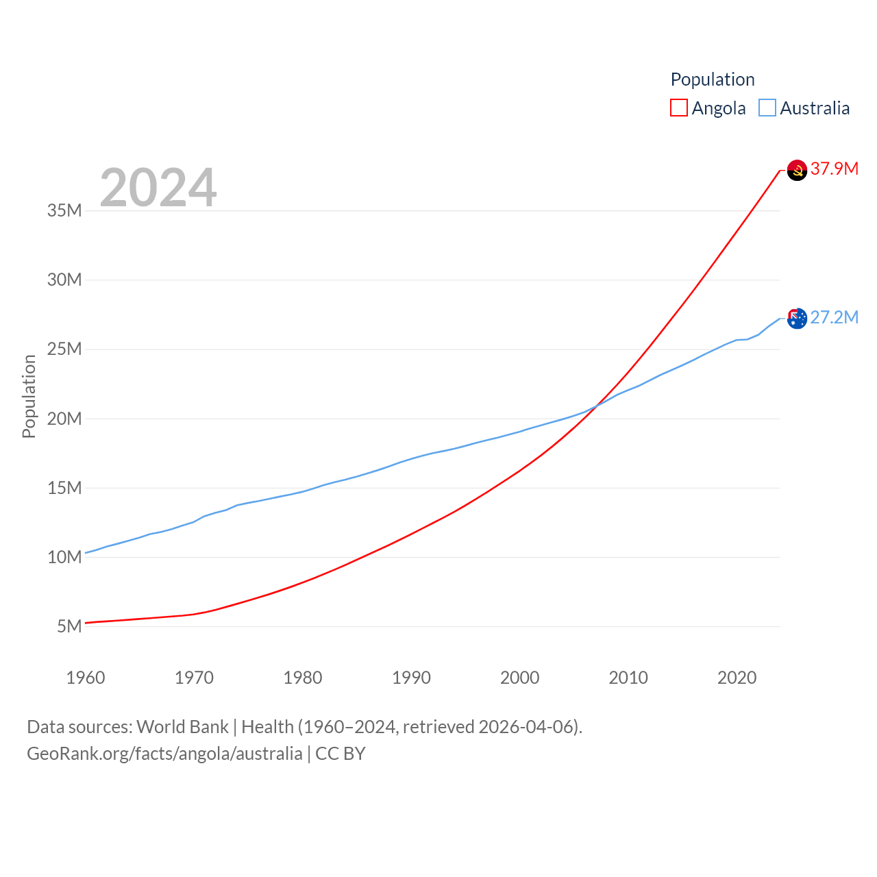 Angola has a population of 37.9M (ranked 40/197), compared with 27.2M in Australia (ranked 54/197). Angola's land area is 481,354 sq mi versus 2,969,906 sq mi for Australia (ranked 22nd vs. 6th).