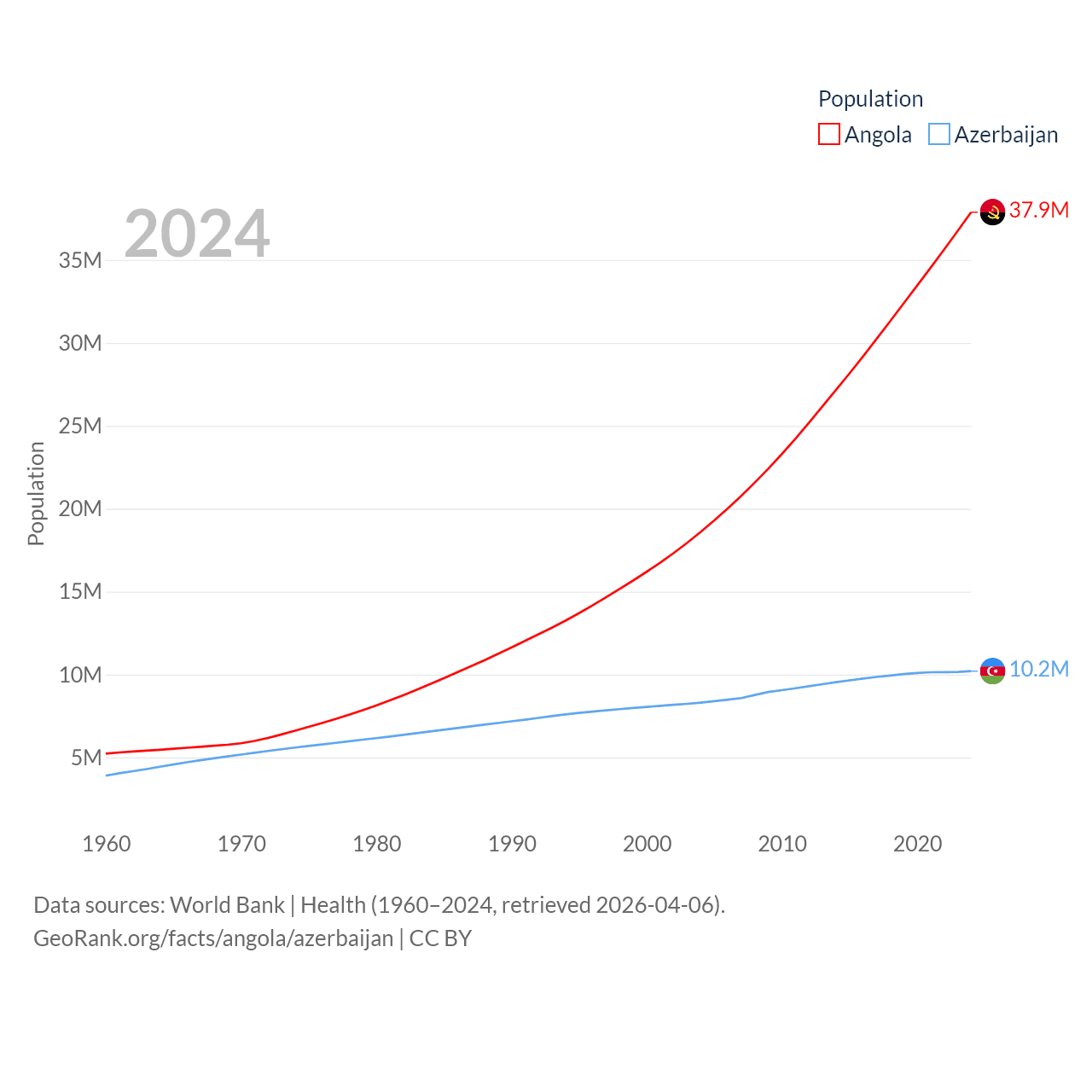 Angola has a population of 37.9M (ranked 40/197), compared with 10.2M in Azerbaijan (ranked 95/197). Angola's land area is 481,354 sq mi versus 31,911 sq mi for Azerbaijan (ranked 22nd vs. 112th).