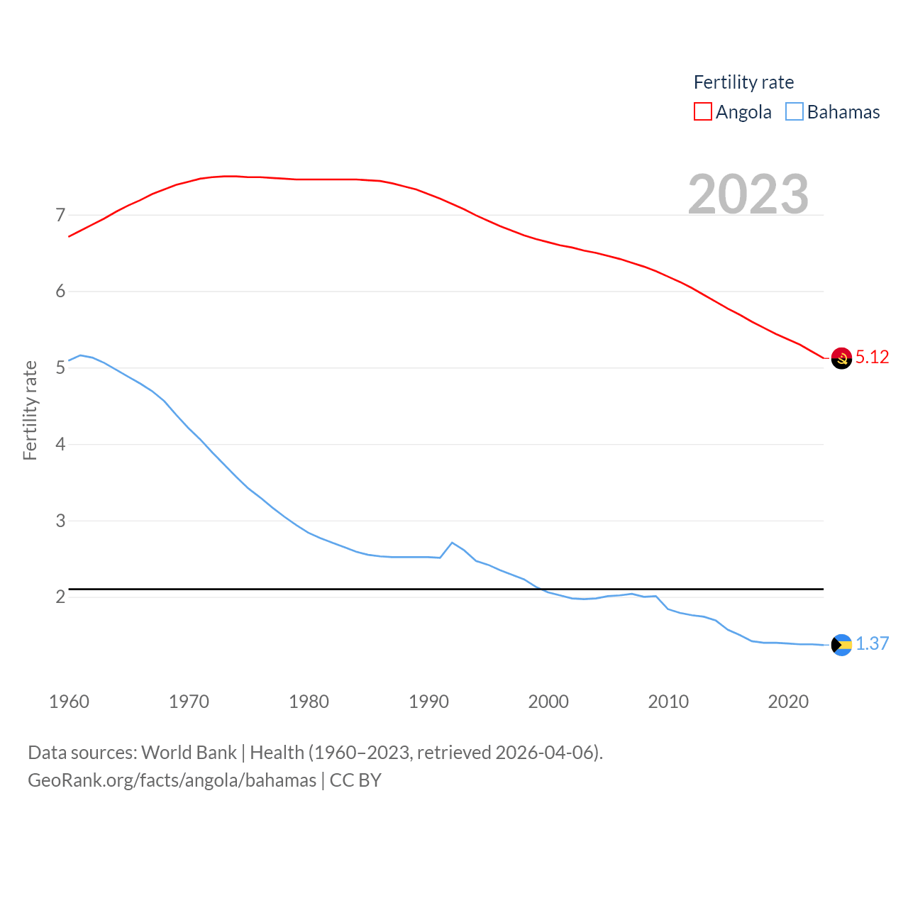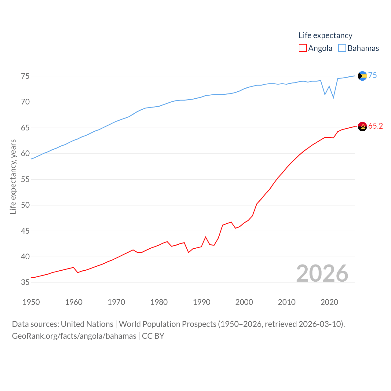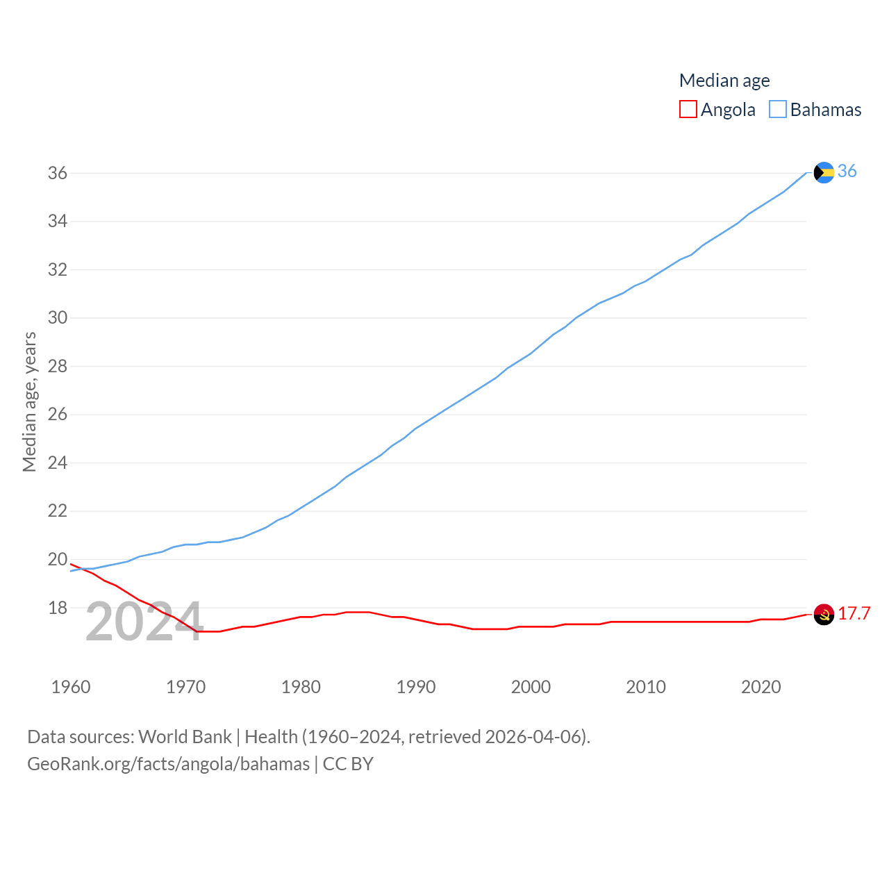 Angola has a population of 37.9M (ranked 40/197), compared with 401K in The Bahamas (ranked 172/197). Angola's land area is 481,354 sq mi versus 3,865 sq mi for The Bahamas (ranked 22nd vs. 162nd).