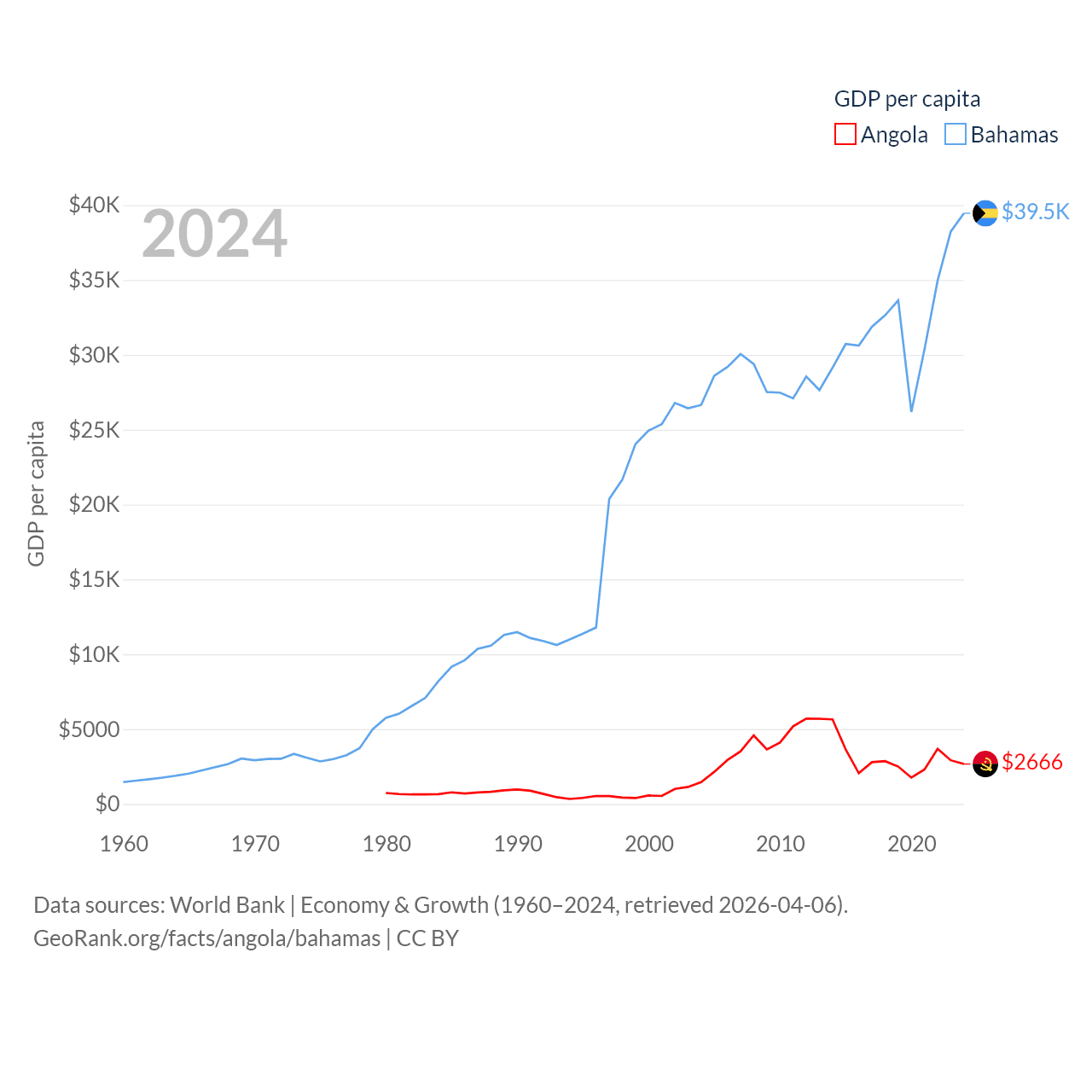 By GDP, Angola ranks 71/197 ($101B) and The Bahamas ranks 140/197 ($15.8B). By GDP per capita, Angola ranks 144/197 ($2,666), while The Bahamas ranks 30/197 ($39,455).