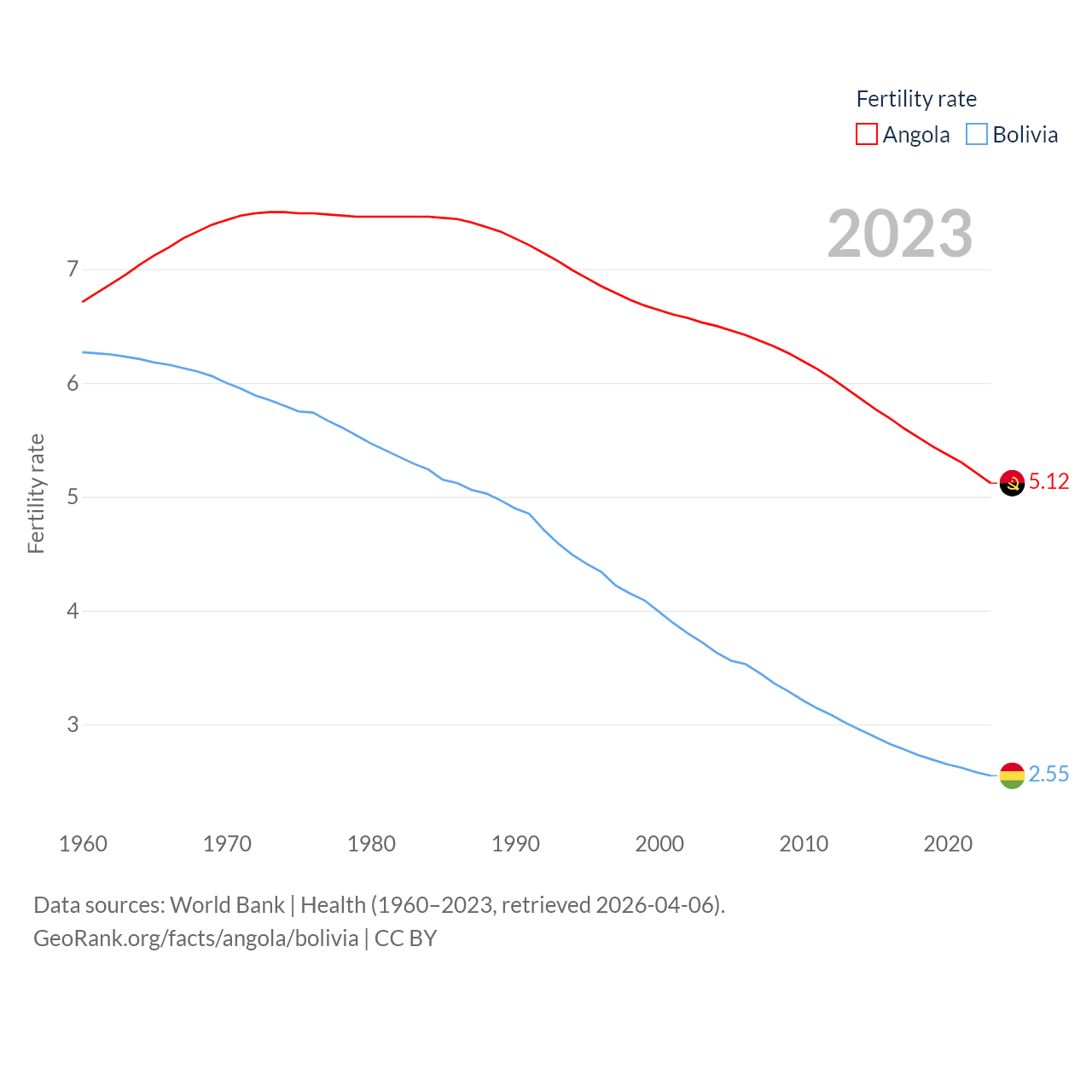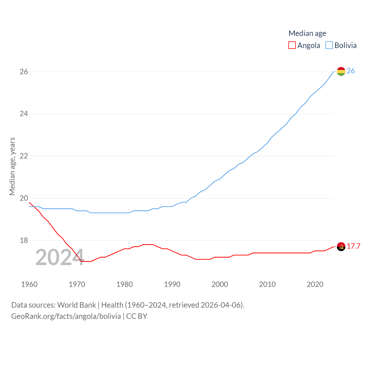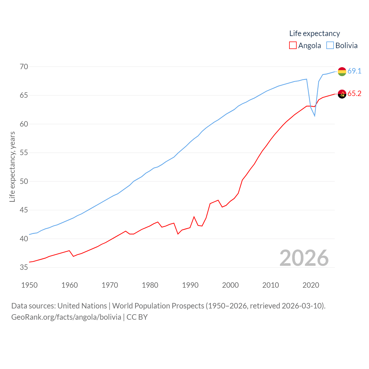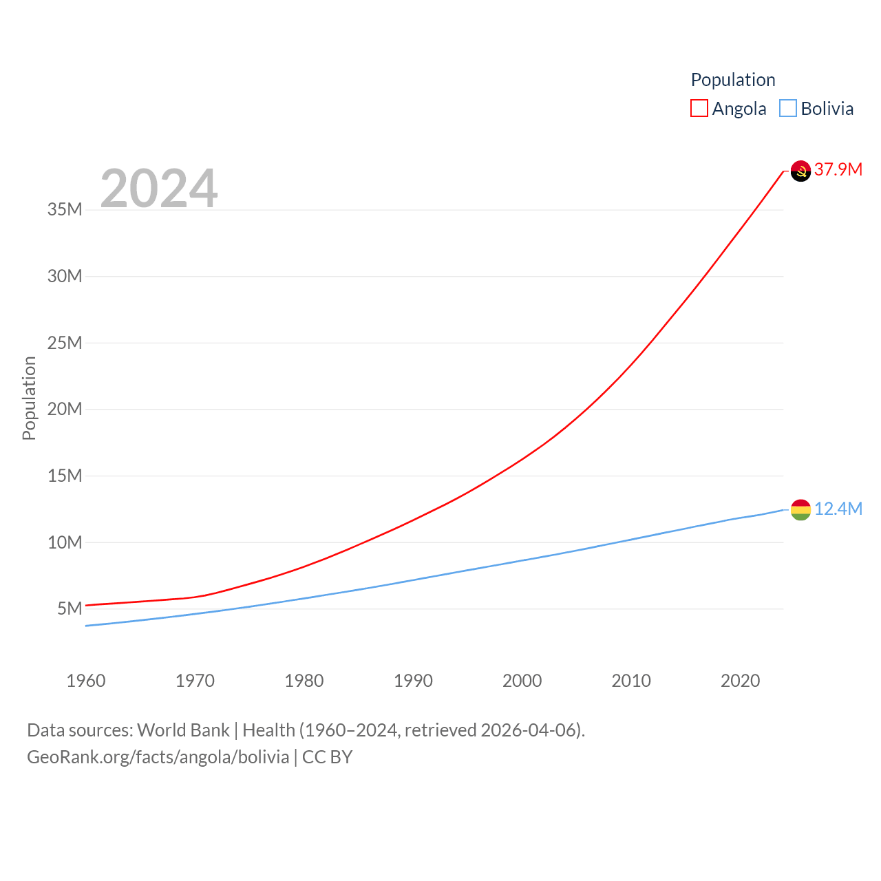 Angola has a population of 37.9M (ranked 40/197), compared with 12.4M in Bolivia (ranked 79/197). Angola's land area is 481,354 sq mi versus 418,264 sq mi for Bolivia (ranked 22nd vs. 27th).