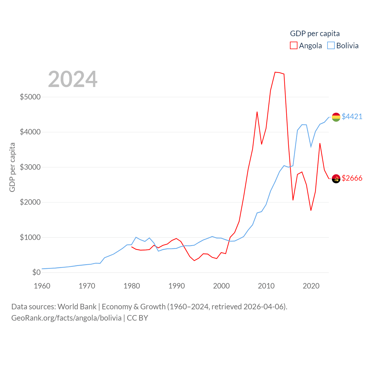 By GDP, Angola ranks 71/197 ($101B) and Bolivia ranks 88/197 ($54.9B). By GDP per capita, Angola ranks 144/197 ($2,666), while Bolivia ranks 125/197 ($4,421).