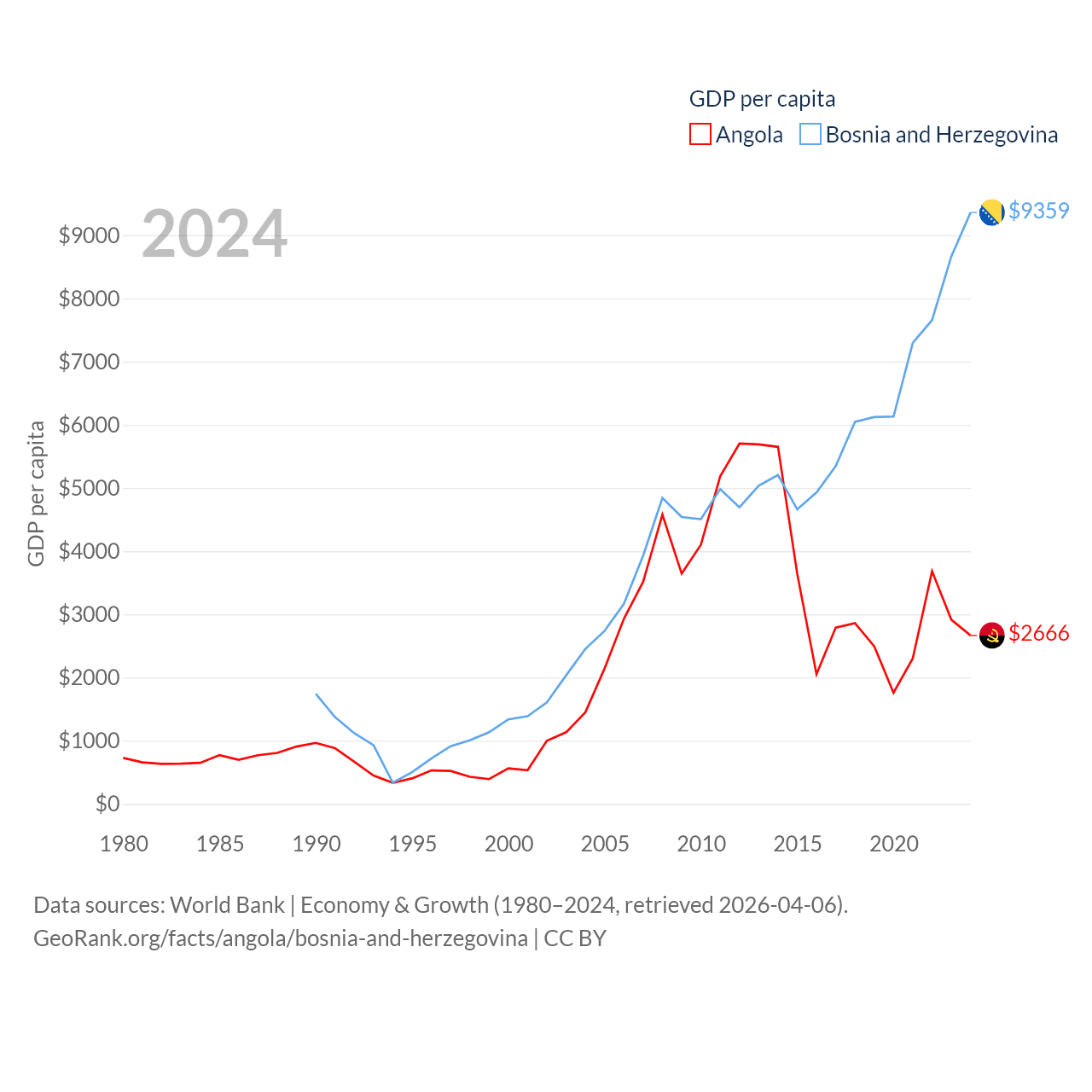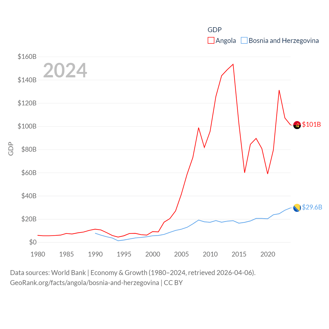 By GDP, Angola ranks 71/197 ($101B) and Bosnia and Herzegovina ranks 111/197 ($29.6B). By GDP per capita, Angola ranks 144/197 ($2,666), while Bosnia and Herzegovina ranks 87/197 ($9,359).