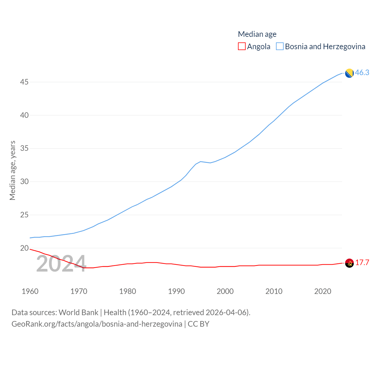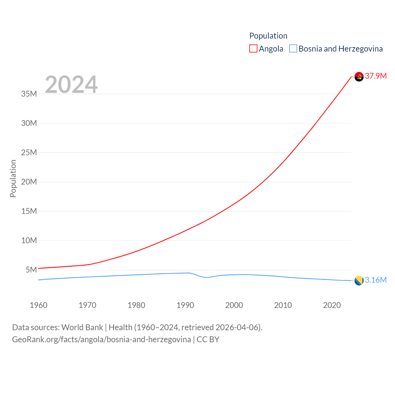 Angola has a population of 37.9M (ranked 40/197), compared with 3.16M in Bosnia and Herzegovina (ranked 134/197). Angola's land area is 481,354 sq mi versus 19,768 sq mi for Bosnia and Herzegovina (ranked 22nd vs. 125th).