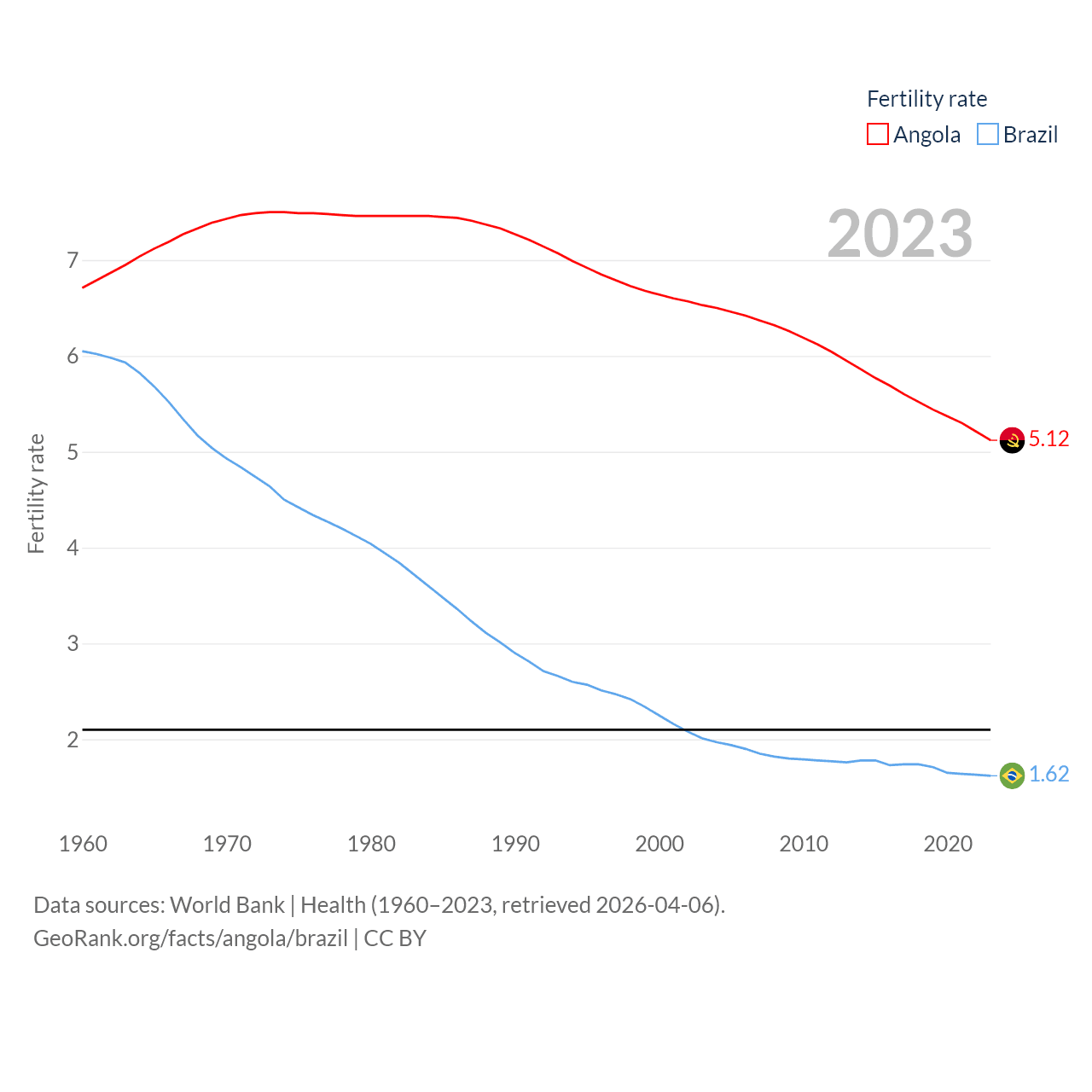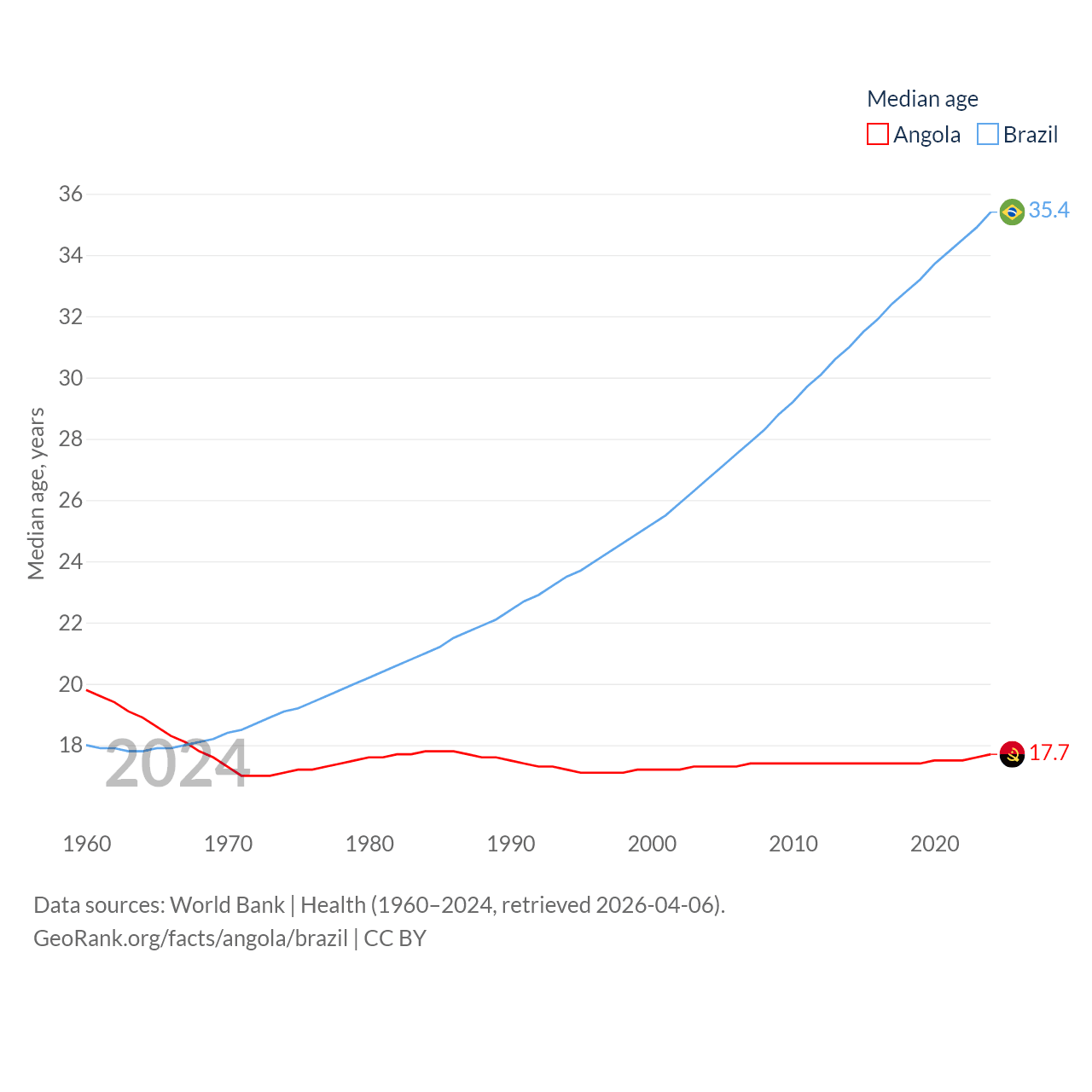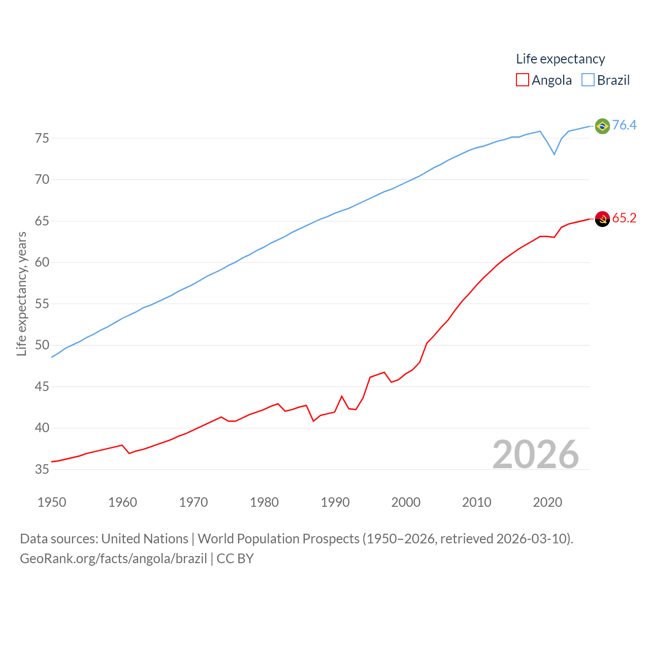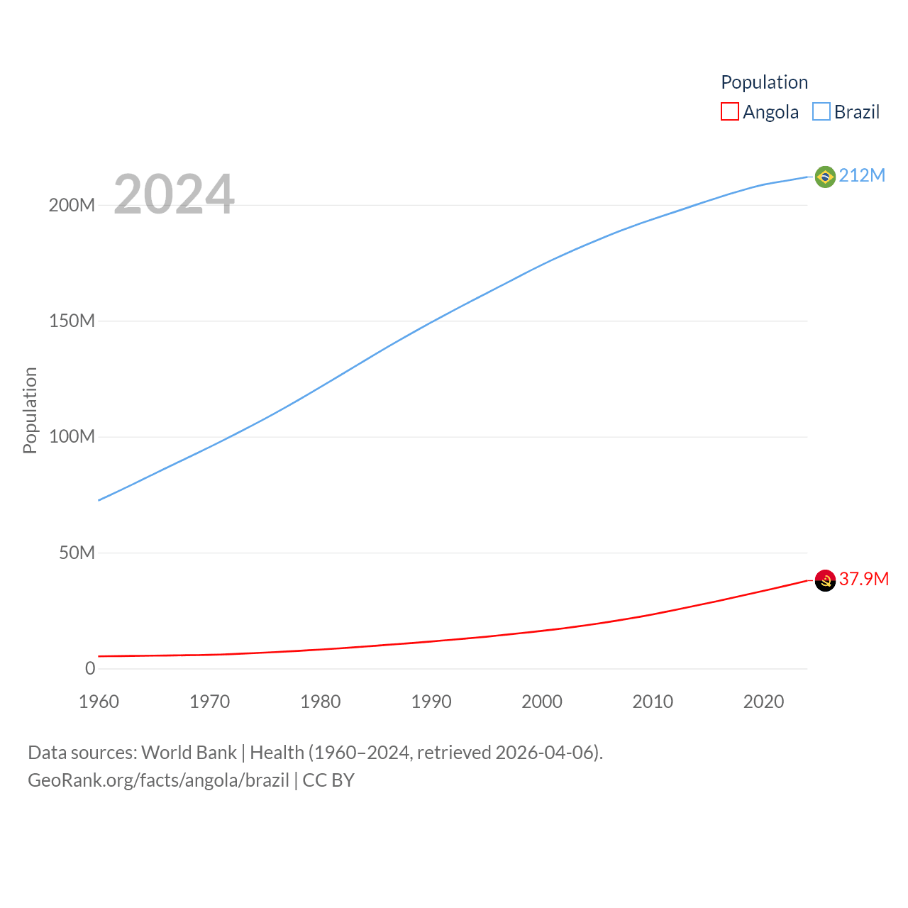 Angola has a population of 37.9M (ranked 40/197), compared with 212M in Brazil (ranked 7/197). Angola's land area is 481,354 sq mi versus 3,227,096 sq mi for Brazil (ranked 22nd vs. 5th).