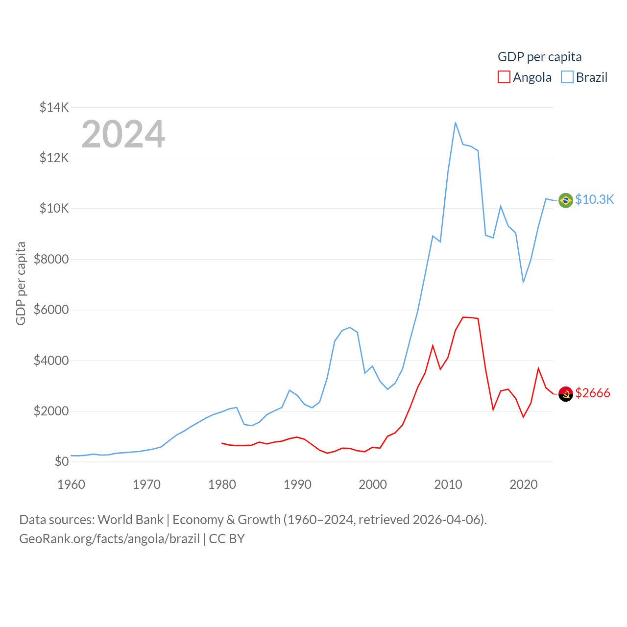 By GDP, Angola ranks 71/197 ($101B) and Brazil ranks 10/197 ($2.19T). By GDP per capita, Angola ranks 144/197 ($2,666), while Brazil ranks 85/197 ($10,311).