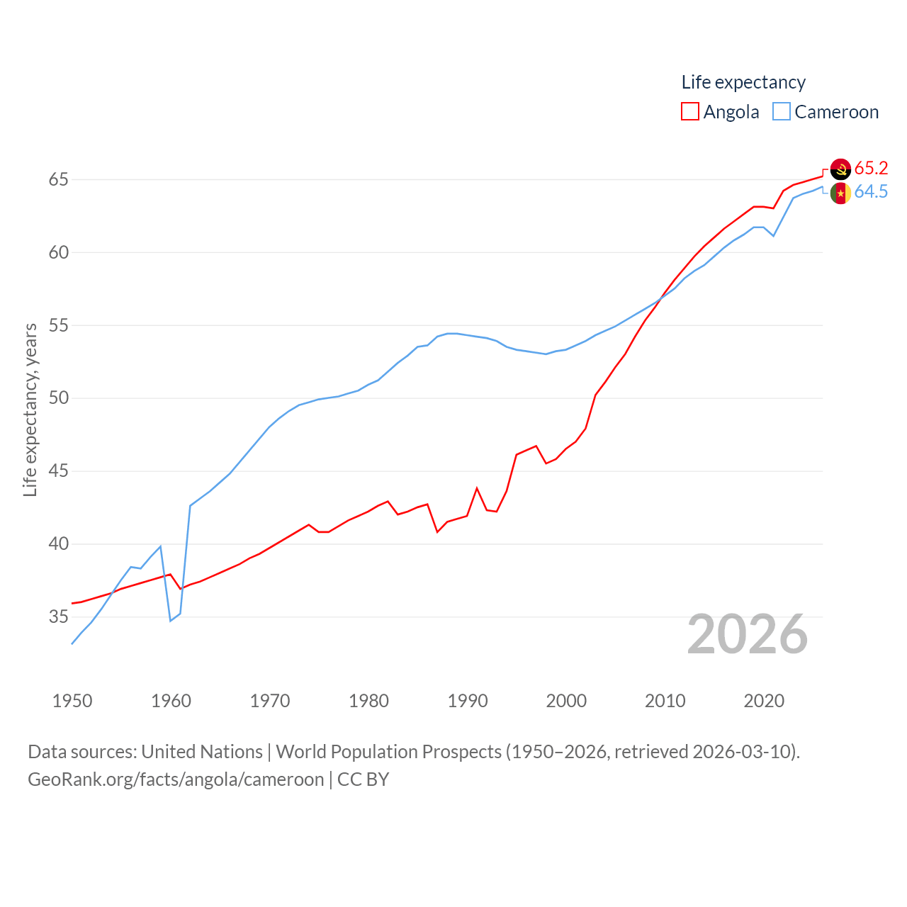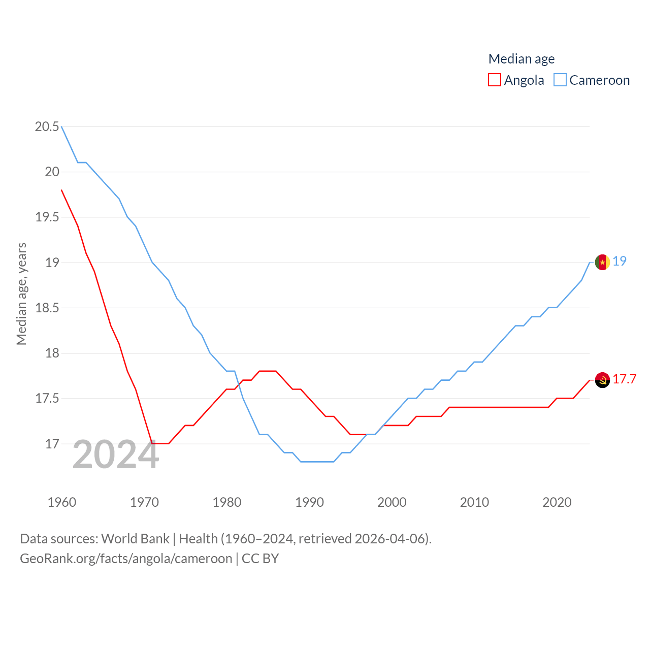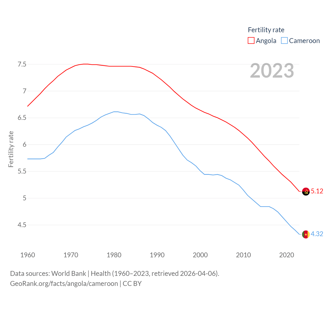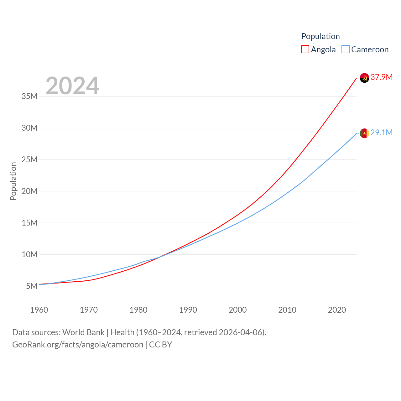 Angola has a population of 37.9M (ranked 40/197), compared with 29.1M in Cameroon (ranked 52/197). Angola's land area is 481,354 sq mi versus 182,514 sq mi for Cameroon (ranked 22nd vs. 52nd).