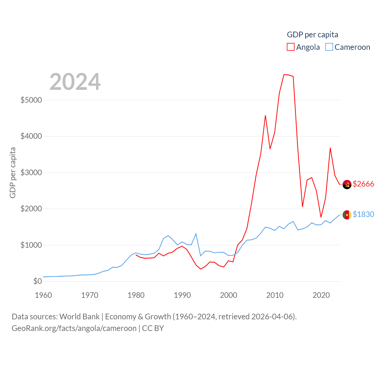 By GDP, Angola ranks 71/197 ($101B) and Cameroon ranks 91/197 ($53.3B). By GDP per capita, Angola ranks 144/197 ($2,666), while Cameroon ranks 158/197 ($1,830).