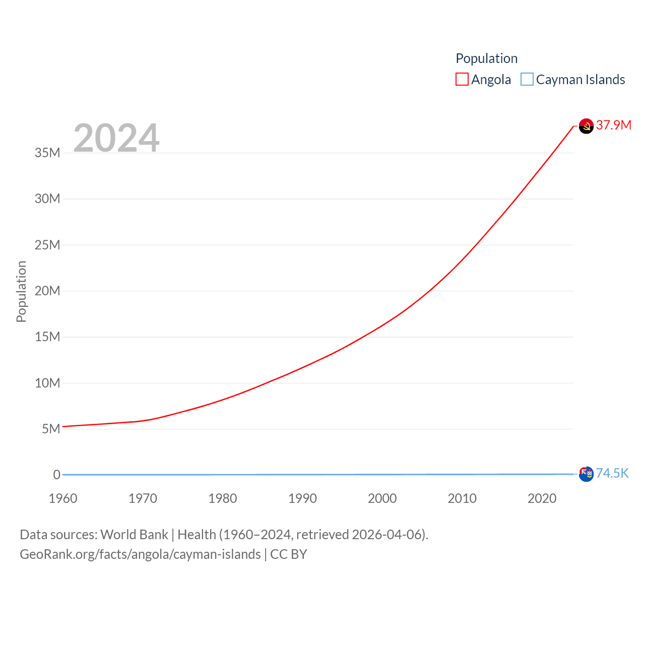Angola has a population of 37.9M (ranked 40/197), compared with 74.5K in The Cayman Islands (ranked 187/197). Angola's land area is 481,354 sq mi versus 92.7 sq mi for The Cayman Islands (ranked 22nd vs. 190th).