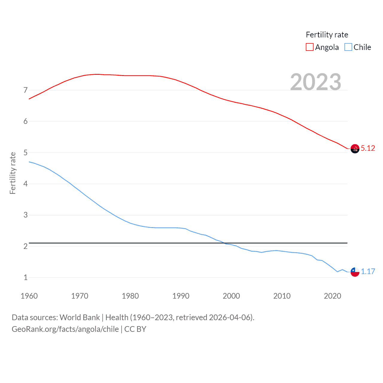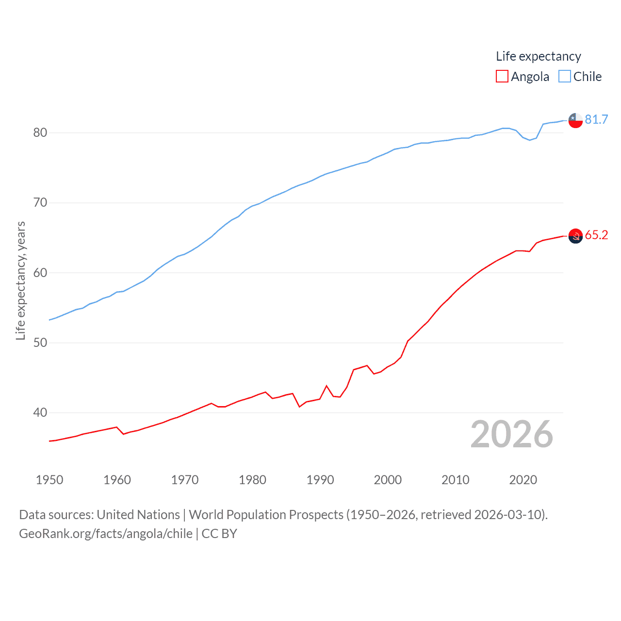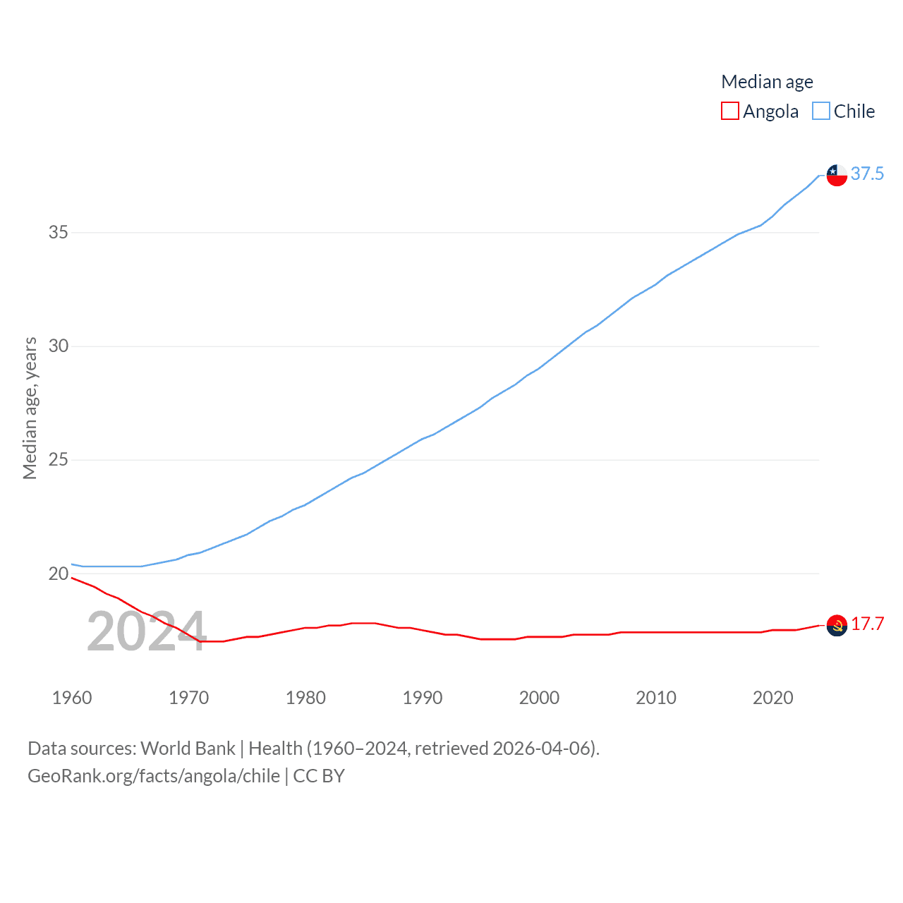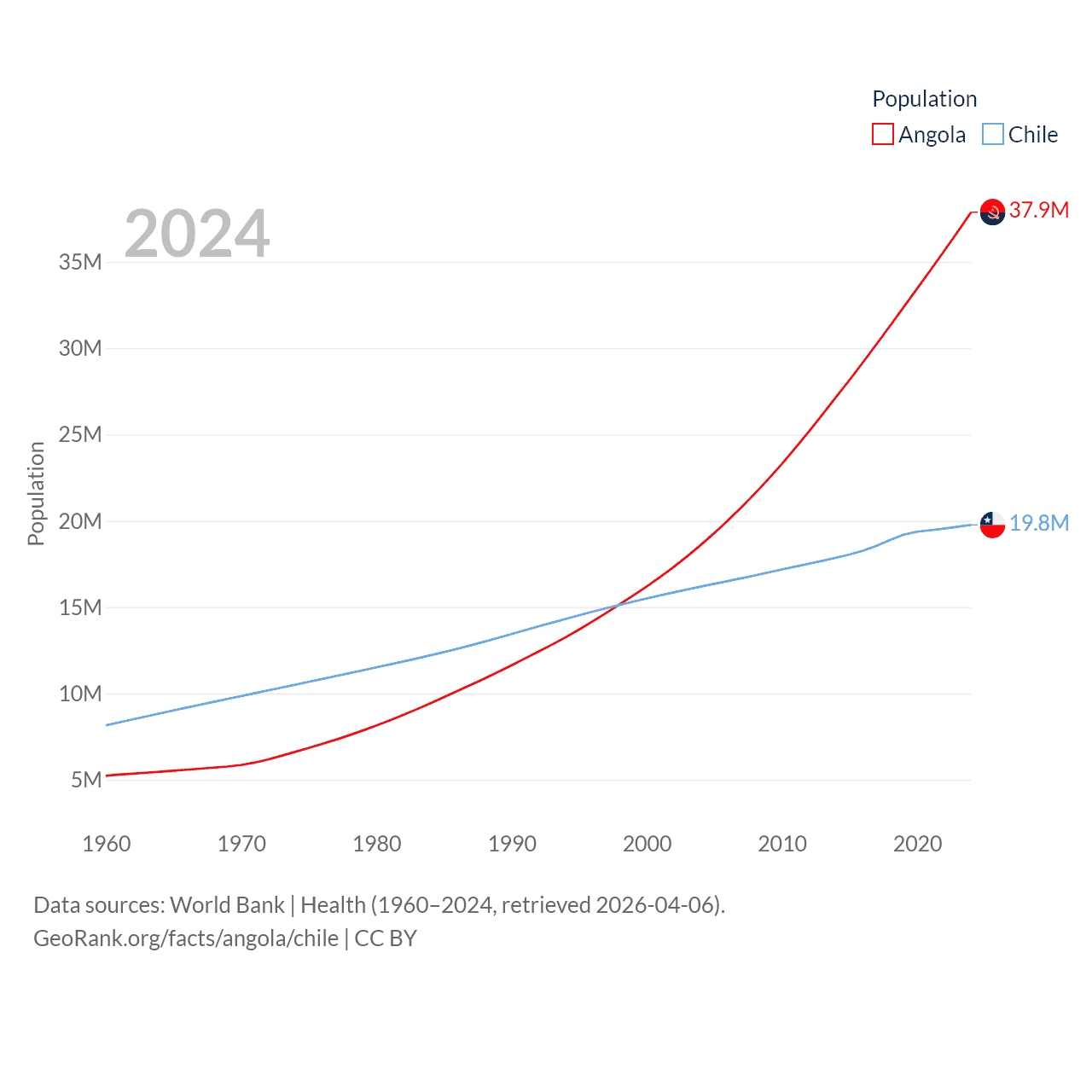 Angola has a population of 37.9M (ranked 40/197), compared with 19.8M in Chile (ranked 66/197). Angola's land area is 481,354 sq mi versus 286,809 sq mi for Chile (ranked 22nd vs. 38th).