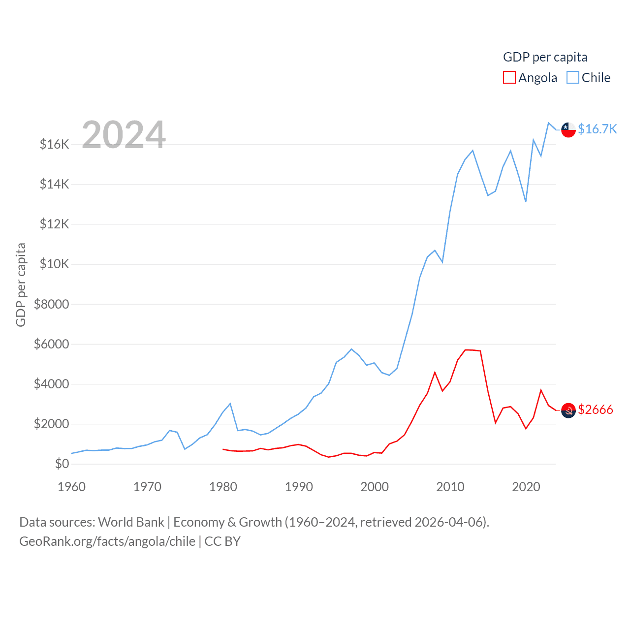 By GDP, Angola ranks 71/197 ($101B) and Chile ranks 45/197 ($330B). By GDP per capita, Angola ranks 144/197 ($2,666), while Chile ranks 65/197 ($16,710).