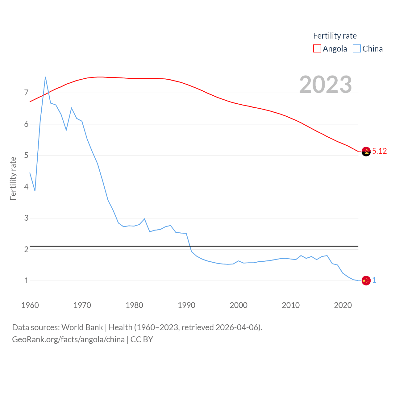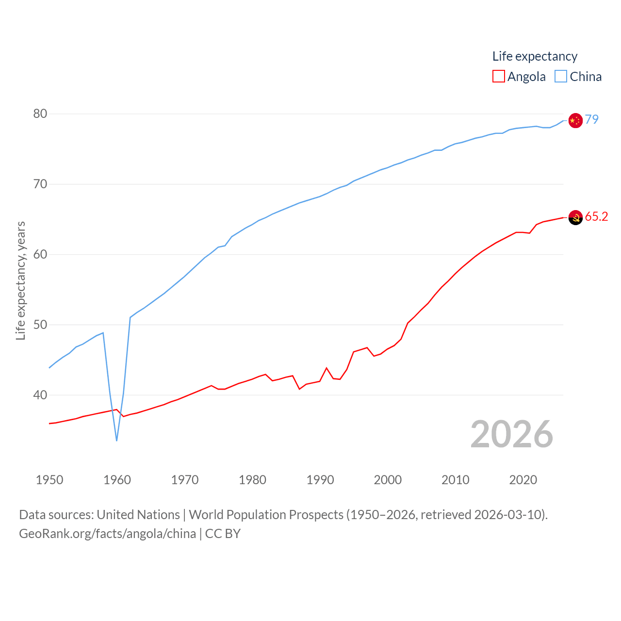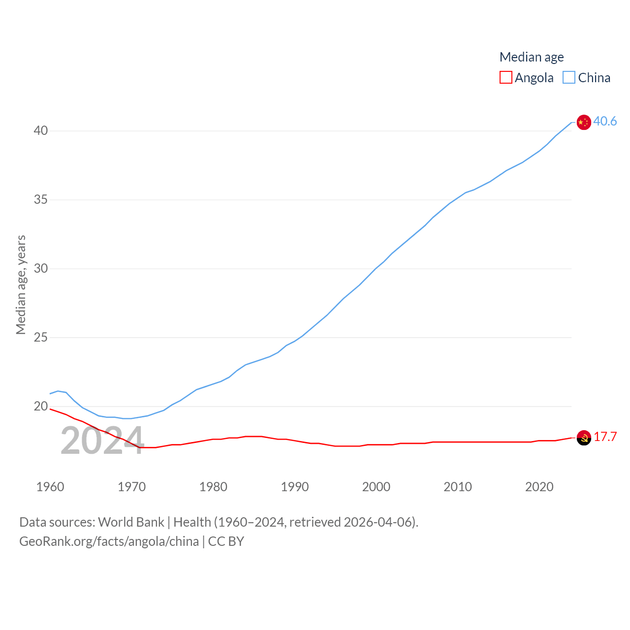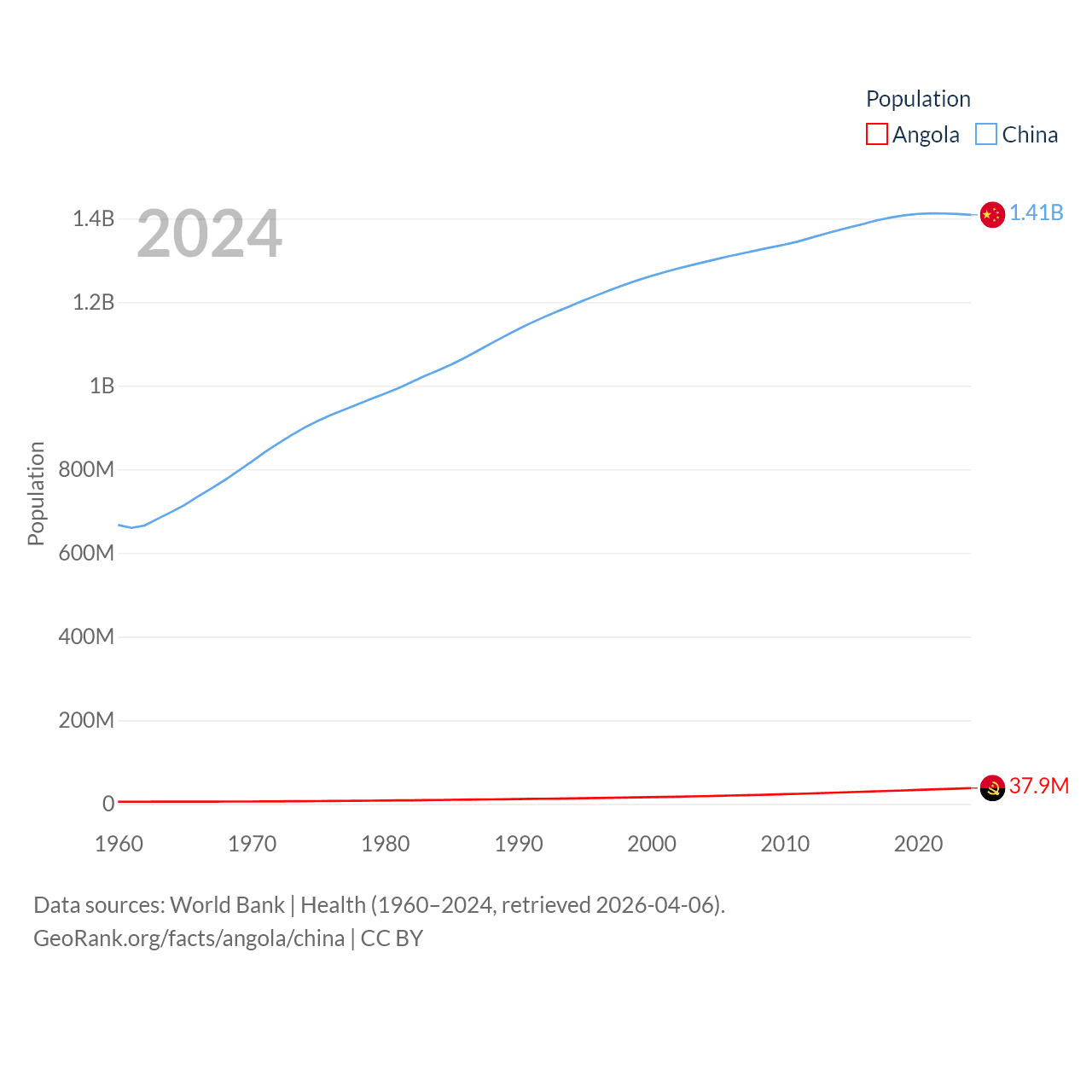 Angola has a population of 37.9M (ranked 40/197), compared with 1.41B in China (ranked 2/197). Angola's land area is 481,354 sq mi versus 3,624,808 sq mi for China (ranked 22nd vs. 2nd).