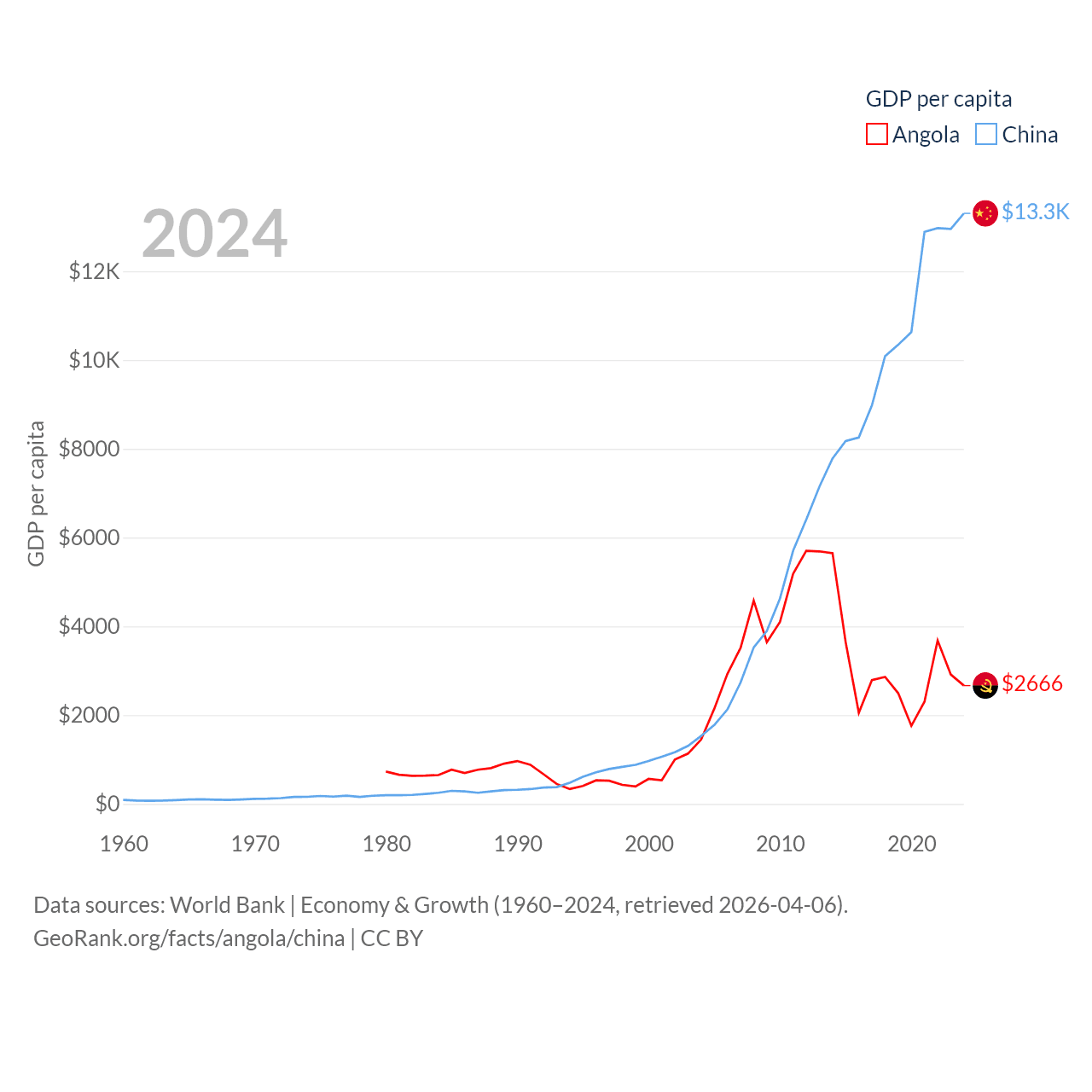 By GDP, Angola ranks 71/197 ($101B) and China ranks 2/197 ($18.7T). By GDP per capita, Angola ranks 144/197 ($2,666), while China ranks 76/197 ($13,303).