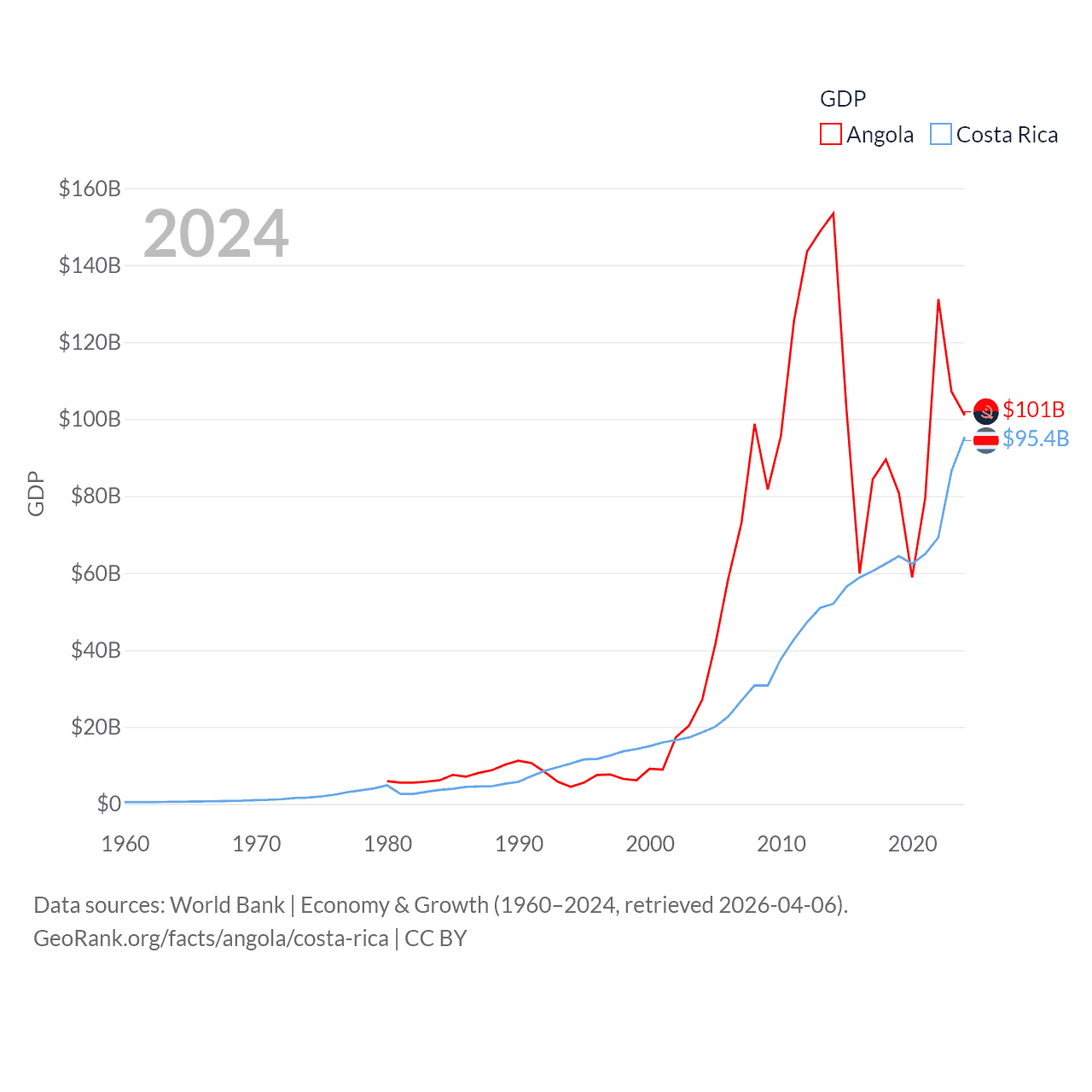 By GDP, Angola ranks 71/197 ($101B) and Costa Rica ranks 73/197 ($95.4B). By GDP per capita, Angola ranks 144/197 ($2,666), while Costa Rica ranks 62/197 ($18,587).