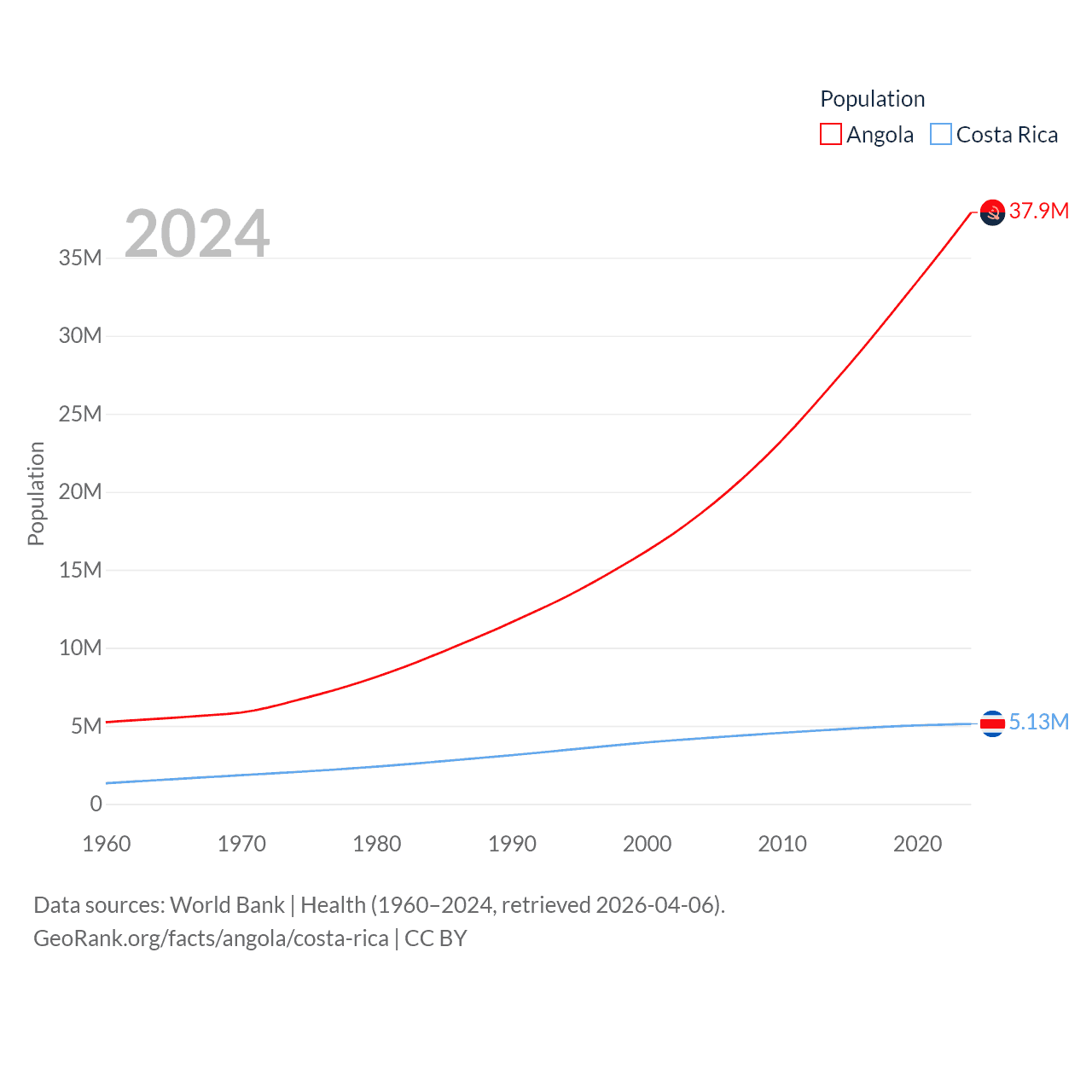 Angola has a population of 37.9M (ranked 40/197), compared with 5.13M in Costa Rica (ranked 126/197). Angola's land area is 481,354 sq mi versus 19,714 sq mi for Costa Rica (ranked 22nd vs. 126th).